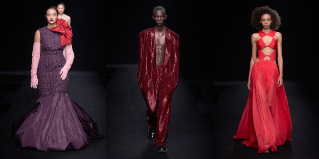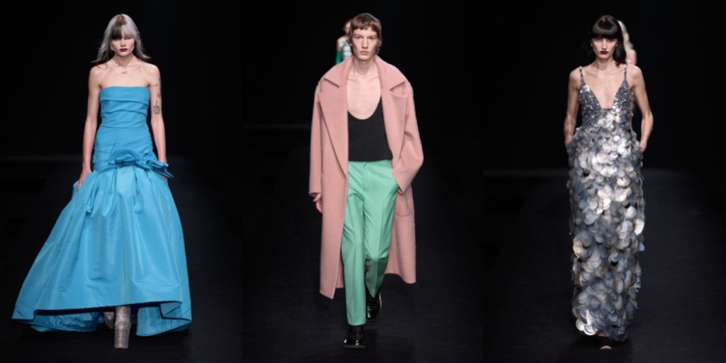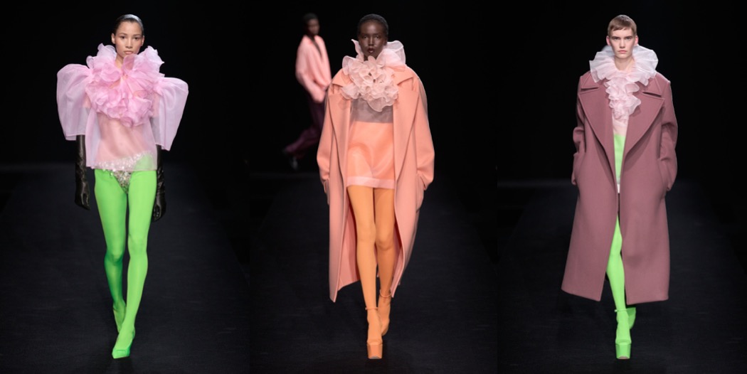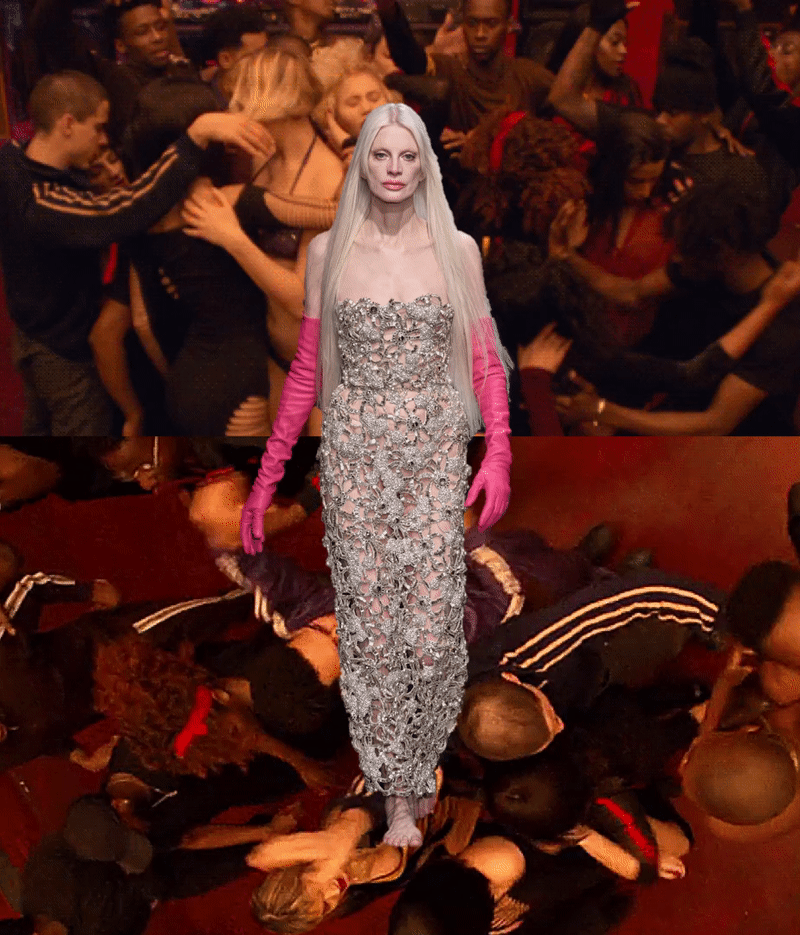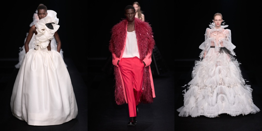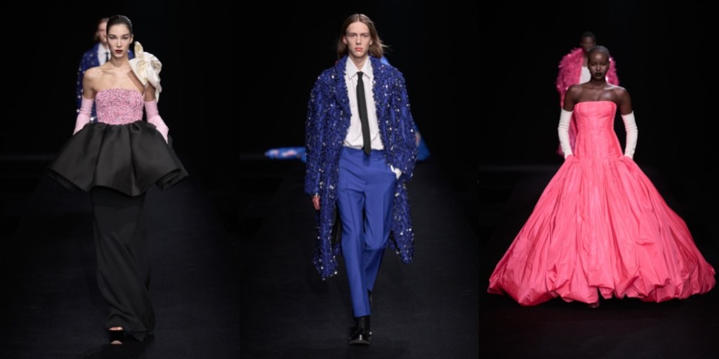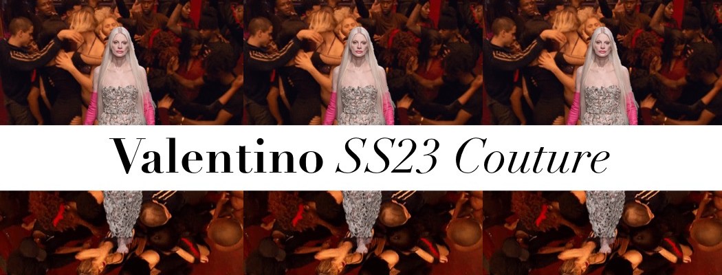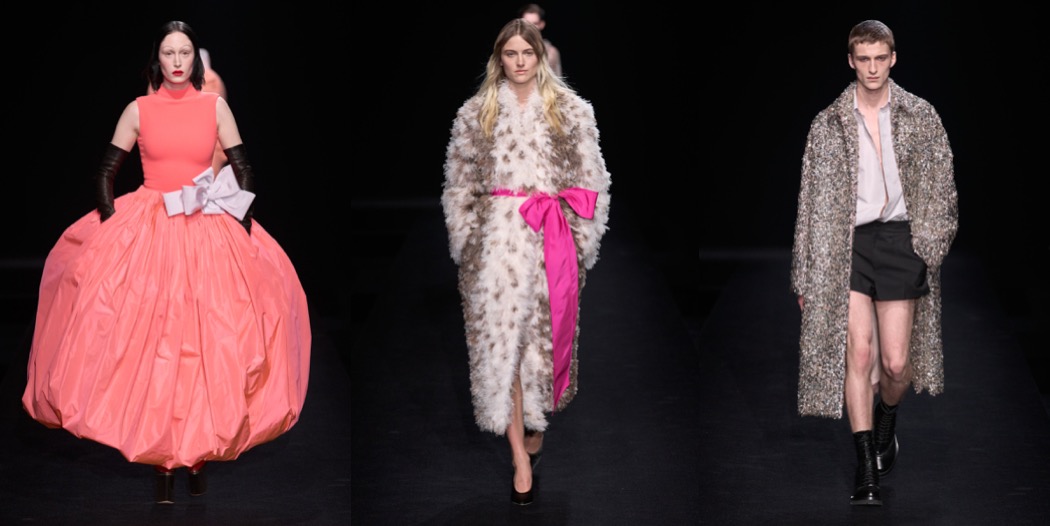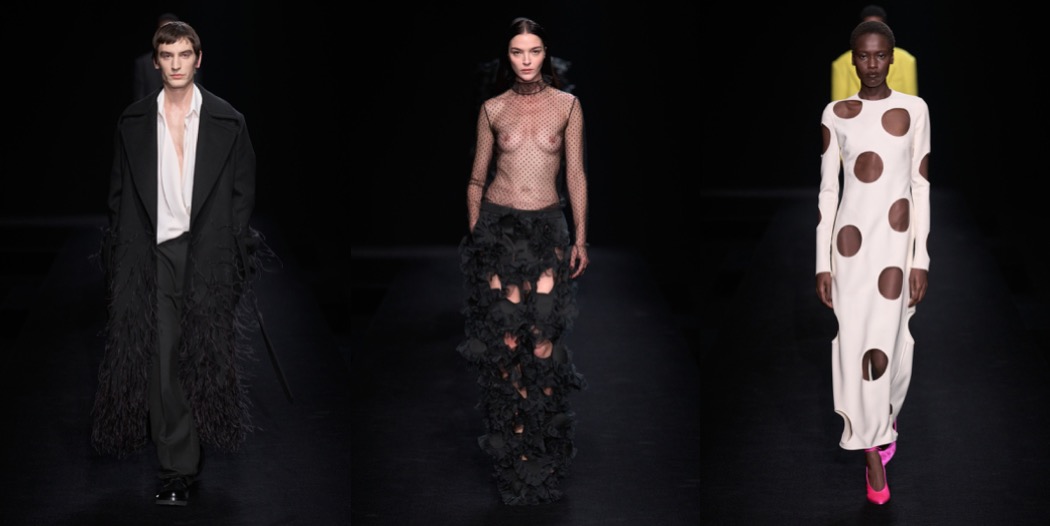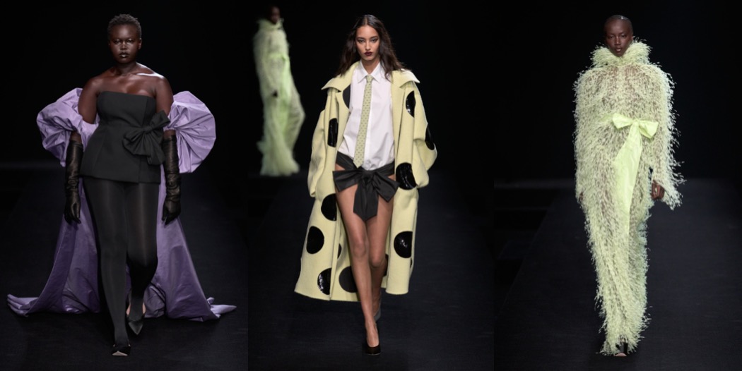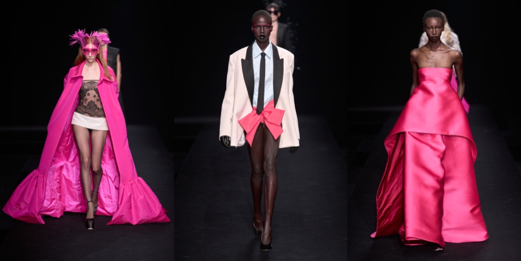 This season, Pierpaolo Piccioli took Valentino haute couture to the club, leaving behind the highly elevated feeling he so succesfully conveyed in the last couple or years. His venue, at night, was a famous Paris joint under the Pont Alexandre. His point about standing for inclusivity is definitely intended to be heard by the wider world of young people. “Of course, I love it that haute couture is about the magic of impossible challenges,” he began. “Of course it’s about craft, and we talk about that all the time, but I also love it when couture feels effortless. It’s all about the feeling of having something for yourself. It’s kind of democratic in a way, in the idea of showing this freedom of being whoever you want to be.” On his inspiration board were photos of clubs in the 1980s, ranging from Studio 54 to London’s New Romantic Blitz Club, the Club For Heroes one-nighter and the Taboo, hosted by the outrageous performance artist Leigh Bowery. What all these scenes, underground or jet-set, had in common was that they were hotbeds for generating fashion and havens for what used to be called ‘gender-bending.’ “The difference was that then, it was behind closed doors. Now it’s something we have for life. It’s today’s way of freedom,” he argued. “So I love the idea of a club, but it’s a club for today. Thinking of inclusivity as welcoming people for who they are, and who they want to be. So it’s invitation to be free to be what you want ro be, mixed with the codes of Mr. Valentino in the ’80s.” Still, haute couture formalities were observed in a way – Valentino’s creatures of the night weren’t presented as a wild crowd of dancers, but as models walking on a runway, haute couture standards of solemnity preserved. What emerged from the darkness were pops of color, dark Parisian sexy black transparent lingerie dresses, and many varieties of strategic body-exposure. In 89 looks, Piccioli put forward individualism in tiny pelmet skirts or cutaway bodysuits implanted with giant bows worn with floor-trailing capes, a dress with cutout polkadot portholes, and white shirts and ties styled with micro-minis (one with a dramatic red sequin trench). In overall this wasn’t my favorite Valentino couture moment, but Piccioli definitely had some working on it.