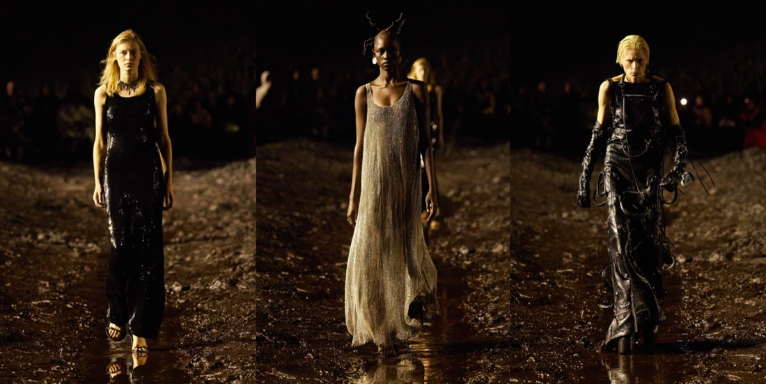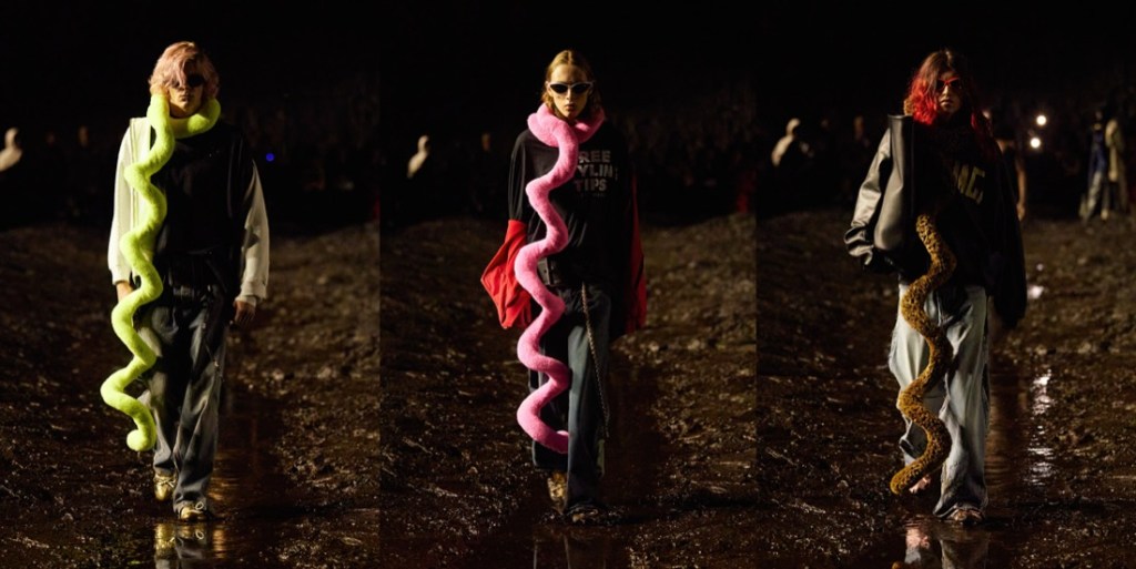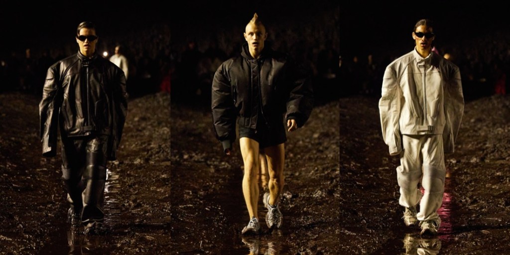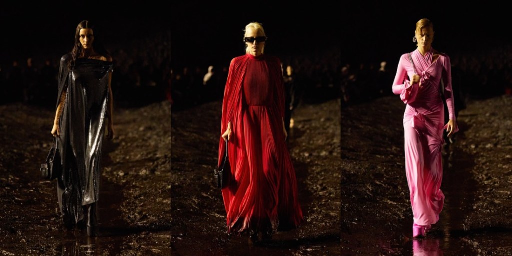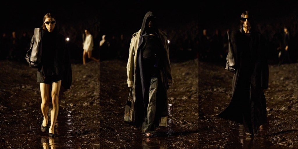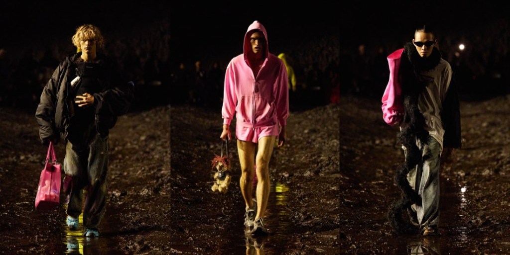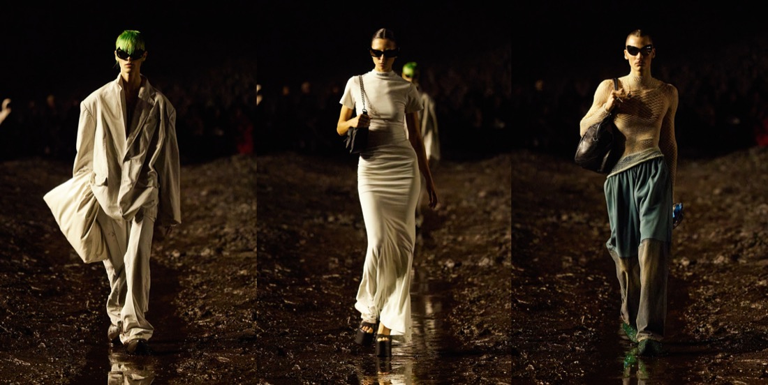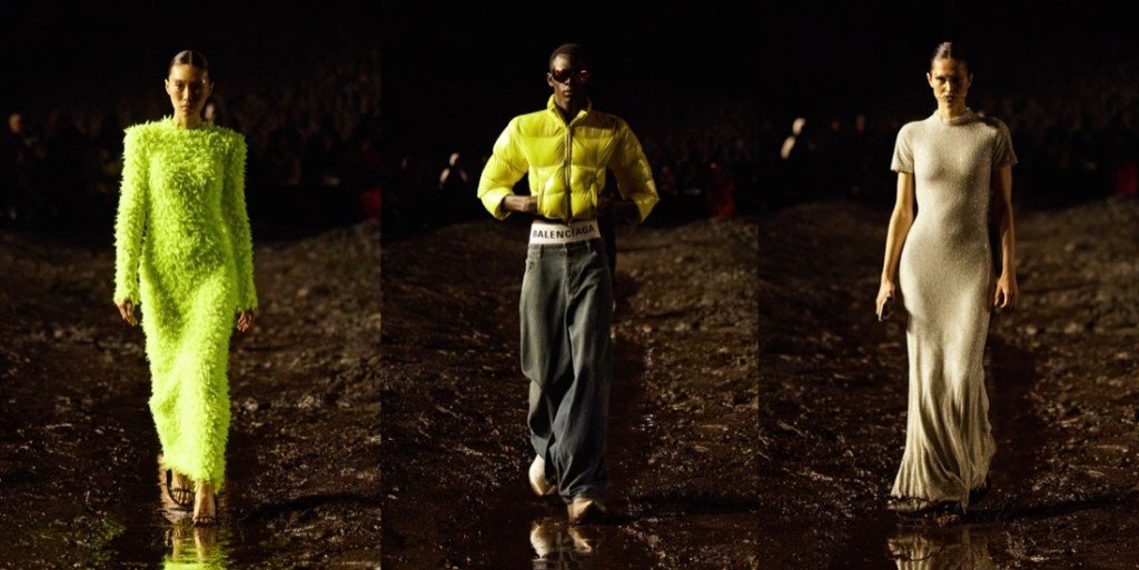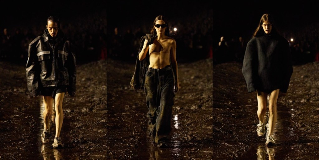 When Balenciaga invited its guests to a “mud show“, they meant it literally. There were tons of mud on the spring-summer 2023 runway, piled up at the sides of the stadium space, and dug out like bomb craters in the center, staged by the Spanish artist Santiago Sierra. The raw odeur of decomposition, a custom-made scent by Sissel Tolaas, blasted in the face. Demna did it yet again: he shook up the fashion industry like no one else, reminding about rising inequality, the return of fascism, wars happening all over the globe, and the very real threat of nuclear war. Kanye West opened the show in a tactical jacket and leather pants with reinforced knees, military garb topped off with a baseball cap and a logo mouthguard. The ragtag band that followed was rough around the edges to say the least, their faces beat-up and their clothes treated to look old and beat-up too (requiring a “couple of days” more than making pristine luxury, Demna said). Some carried bags made from stuffed animals that looked like they’d been through a war. When the 75 models made their circuit on the wet track, dirt splashed their bare ankles and soaked their hems, the 3-D printed Dutch clogs being no match for the mud. Demna has had his own experience of war – he fled Georgia with his family when he was a young boy of 10. Being gay compounded his struggles. “I’ve felt like I’ve been punched in my face for being who I am,” he said, but “you have to stand up and continue walking, kind of like this crusade of discovering who you are and defending that.” He called this a “very me show.” It was heavy on grafitti’d hoodies and ravaged jeans, but there was also evening wear, in clingy T-shirt jersey or glamorous pleats. These were survivors against the odds, a point Demna made by sending out men clutching baby carriers propped with eerily lifelike dolls. “Naturally I’m an optimist, but I cannot be very optimistic right now,” he said. “I think this show actually expresses that very much – the music, the set, it spoke about the moment in which we live.” To finish, Demna sent out a dress made from cut-up parts of black Balenciaga Lariat bags, a make-do-and-mend masterpiece that also pointed up our nasty overconsumption habits. Remember, he sent every last piece through the mud, a “sacrilege” by luxury standards. Using fashion to comment on the crises that plague us is a tricky business. Of course Demna wants us to shop, and of course his bosses do, too. But when it comes time to spend, my money’s on the guy who looks around and is terrified, not the sleepwalkers.
