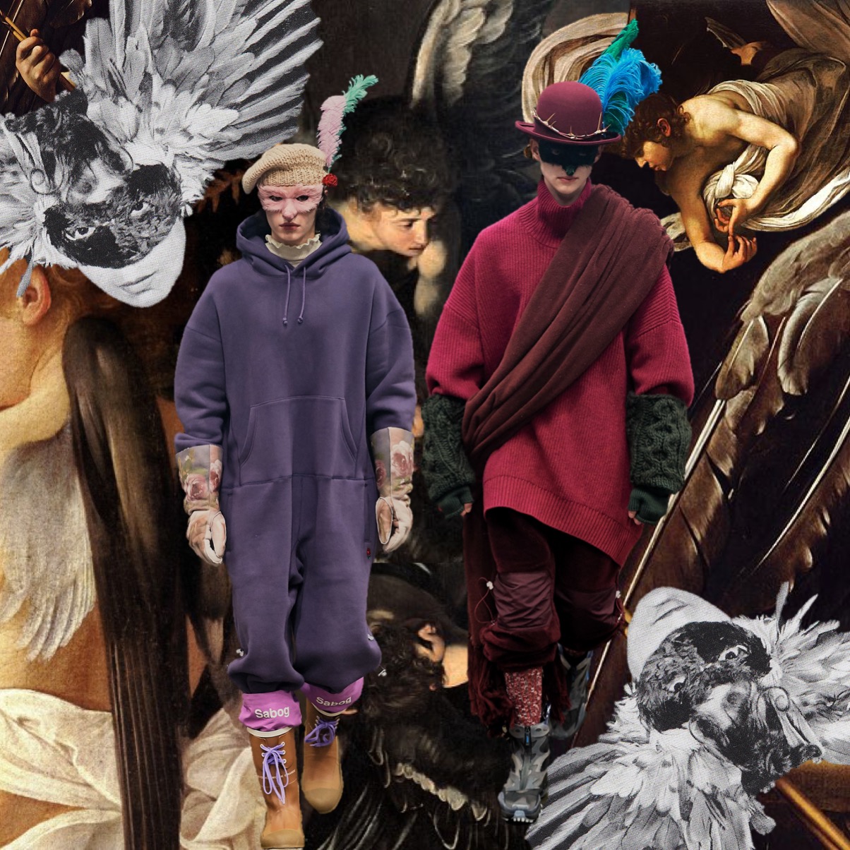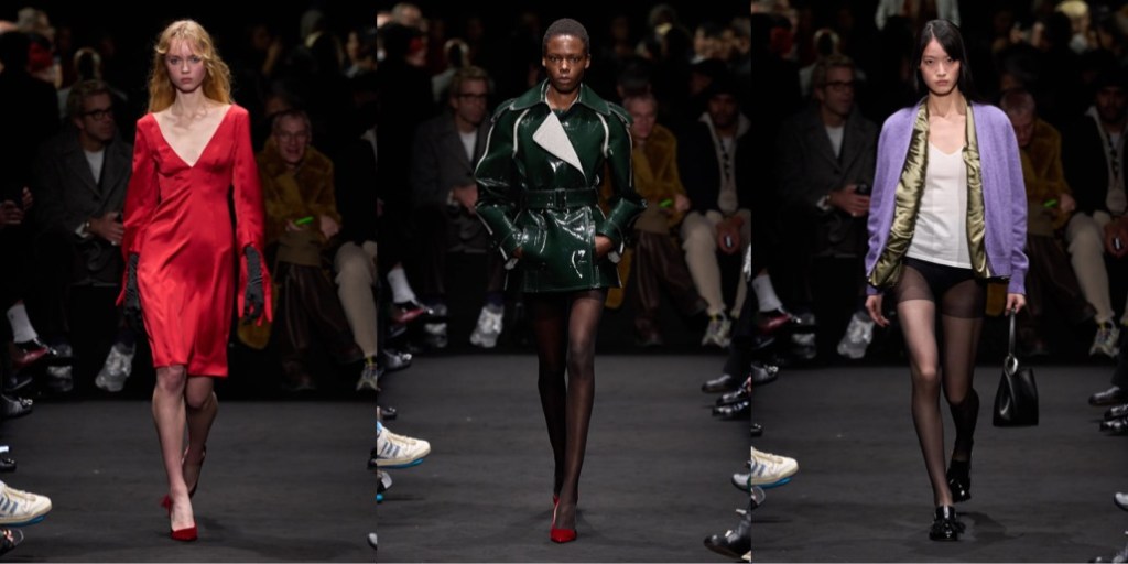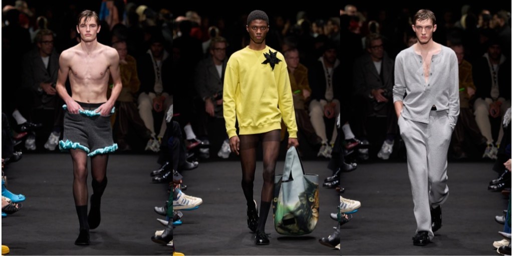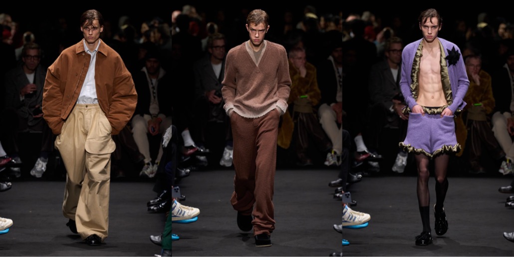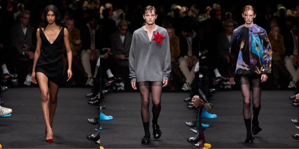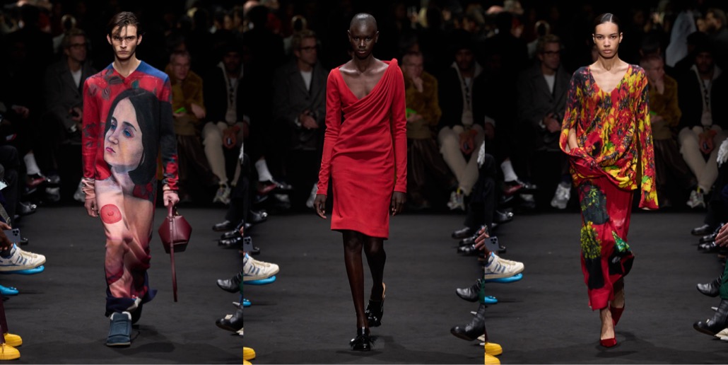 Jonathan Anderson said in his autumn-winter 2024 preview: “Eyes Wide Shut is one of my favorite films, and I actually think it’s a great Christmas film.” It was, however, two viewings last summer that led to this JW Anderson collection. “I’ve never made anything about a film before,” said Anderson. “This is also the sexiest we’ve ever gone – as far as I can go.” Fashion world has a great affection for this Stanley Kubrick fim. Lately, Puppets & Puppets had an entire collection dedicated to this spicy romance-thriller. In case of Anderson, the result was a diverse design range, spanning from prim to perverse: both in menswear and women’s pre-fall, at moments in a Prada-ist manner (fun fact: in the 2000s, the Irish designer used to work around Prada at Brown Thomas in Dublin; there he met Manuela Pavesi, Miuccia’s right-hand, where she consulted the brand’s merchandising). For the collection’s hero print, Anderson contacted Christiane, Kubrick’s widow, regarding her paintings that the director used in his films (including A Clockwork Orange and Eyes Wide Shut). These paintings were what spanned the triptych knit jersey dresses: other pieces featured a portrait of a family cat, a pot plant with a barcode still on its tub, and a car interior. Said Anderson: “I thought what was interesting is the psychology of this idea of bringing someone from the background to the foreground.” This was about as literal as Anderson got. The collection contained neither Christmas trees nor masks – although Nicole Kidman was on the soundtrack, delivering the near-to-last line of dialogue – however a palpable spirit of twisted bourgeois eroticism ran through the darkened runway as fil rouge. Red, with all its implications, headlined in an oversized velvet evening jacket for men. The jacket’s womenswear counterpoint was a red velvet jumpsuit with one disordered, asymmetrically cut leg that seemed at the intersection of sleepwear and evening wear. Anderson’s own recurring predilection for shorts was satisfied afresh via some wonderful rib knit pieces – sometimes partnered with cardigans, sometimes not – from whose edges oozed suggestive, unsettlingly domestic whorls of satin. Dressing his female and male models in tights over panties gave a less figure-skating aspect to the trophy underwear trend.
