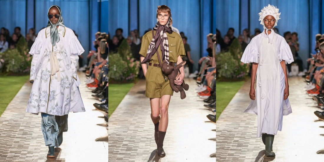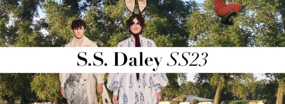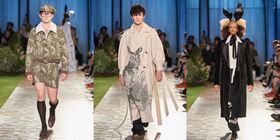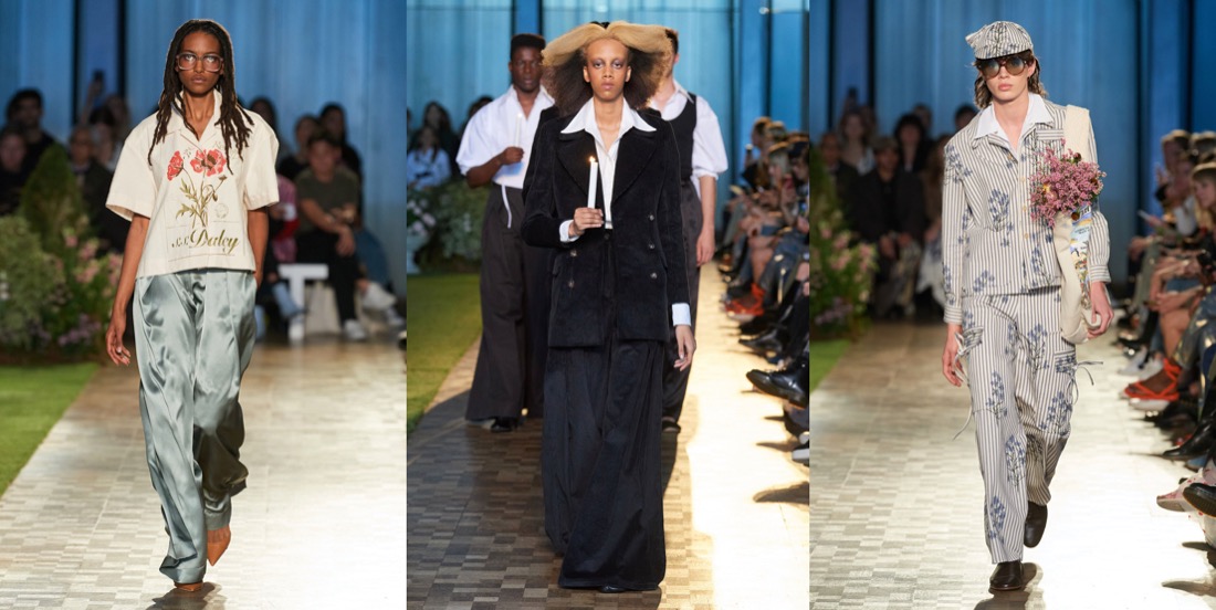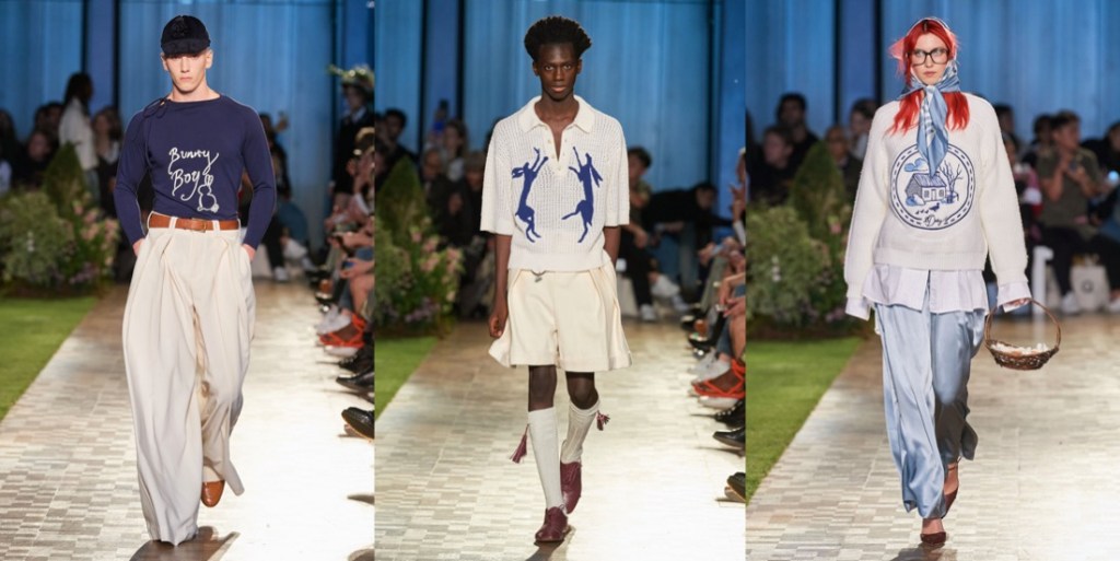 For spring-summer 2023, all kinds of wearable new treats were scattered through the collection in the form of ticking-stripes and balloon-sleeve blouses with botanical prints, sweaters with Wedgwood plate blue-and white embroidery, zip-up cardigans with a pair of rabbits on the front. There was a lot of bunny action, too. The collection’s context was based around a dramatized reading of the love letters between Vita Sackville West and Violet Trefusis. Daley explained that he had come across a sketch from one of Violet’s letters. “It was about a time in the south of France together, when Violet dressed like a man, in a full length morning coat, and they could pass as a couple. A time when they could enjoy love freely.” The women also coined a codeword for writing about their love – it was ‘rabbit.’ The clandestine relationship became increasingly sad, though. “They were trapped, society dragged them apart, and they couldn’t be together.” Daley’s interest, right from college, has always been about looking at the behaviors and dress codes of the British upper classes, chiefly of the 1920 and ’30s, from the point of view of a working class designer. “In my first collections, I was looking through a homosocial gaze at public boys schools. With this, I was doing the same, but with a relationship between two women. It’s quite nice to explore that from a different viewpoint.