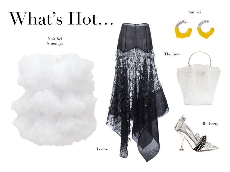 Brock Collection bow-detailed silk-organza dress, Rosie Assoulin “Thousand In One Ways” convertible cable-knit sweater, Sophie Buhai classic earrings, Byredo “Slow Dance” fragrance, Simone Rocha beaded headband & Gucci ankle-strap platform pumps.