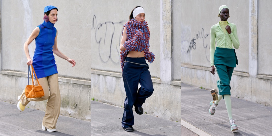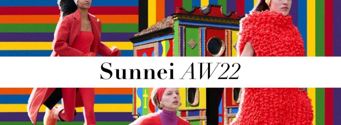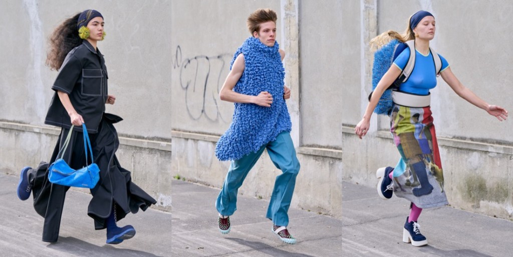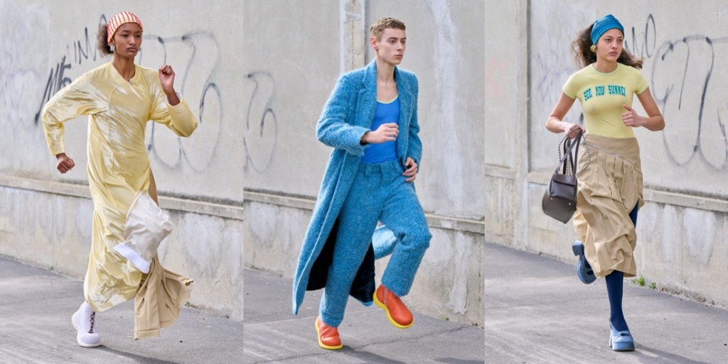 Social commentary always lurks in the background of Sunnei’s practice. The pandemic has offered Simone Rizzo and Loris Messina plenty of open questions to chew on, fashion being rich food-for-thought territory, with game-changing actions still slow to come about within the industry. For starters, fashion’s high-pitched, fast-paced beat hasn’t slowed down (even at the moment when Europe’s peace is under threat), and running from one physical show to the next has become normality again. Collateral effects of frenzy, stress and nerve-racking timetables are part of the picture, despite all the good intentions flaunted when the fashion world was in a state of pandemic shock. Their autumn-winter 2022 show seemed a good occasion for Messina and Rizzo to pick up on our collective scatterbrained state. They rallied their community in an open air set on the outskirts of Milan, where they orchestrated a sort of “performance within the performance” as they called it, with the audience commanded to stand on metal benches, facing the sidewalk near a wall of an industrial building. “We wanted to make people stop for a moment and reflect on what’s happening, especially today, which is such a delicate, disquieting moment,” said the designers. With Russia and Ukraine clashing violently, and war looming on the horizon, the mood was one of uncertainty and worry. Instead of walking, models came running along the wall, while the audience was invited to follow the show in slow motion through their iPhones. As a sort of metaphoric “crystallization of the moment,” as the designers called it, it was quite fitting. As for the collection, it was quite hard to see the details with models running at lightening speed, but the clothes looked fit for such an athletic performance. “We’ve used a new technical fabric that extends and stretches, perfect for layering,” said the designers. They riffed on their core items, “focusing on what we do best, experimenting on making our favorite shapes more extreme and radical, without detracting from their identity and character.” While keeping their offer sleek and minimal, they went quite eclectic, playing with colors and textures with a more tactile appeal on balaclava-capes in furry wool and chenille woven into wavy 3D motifs.