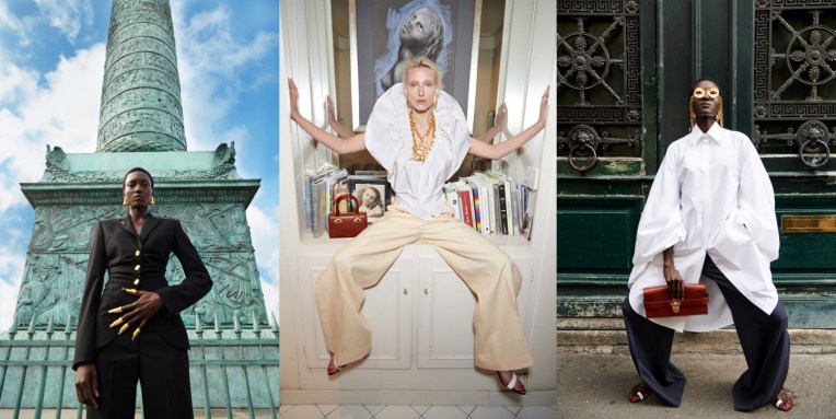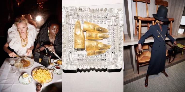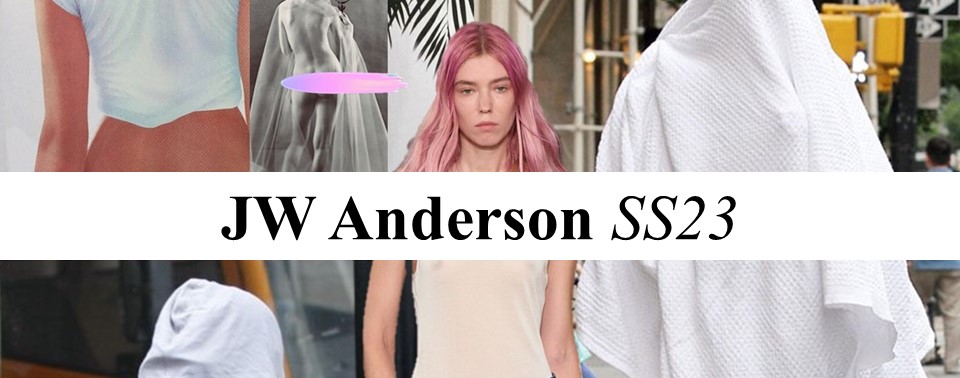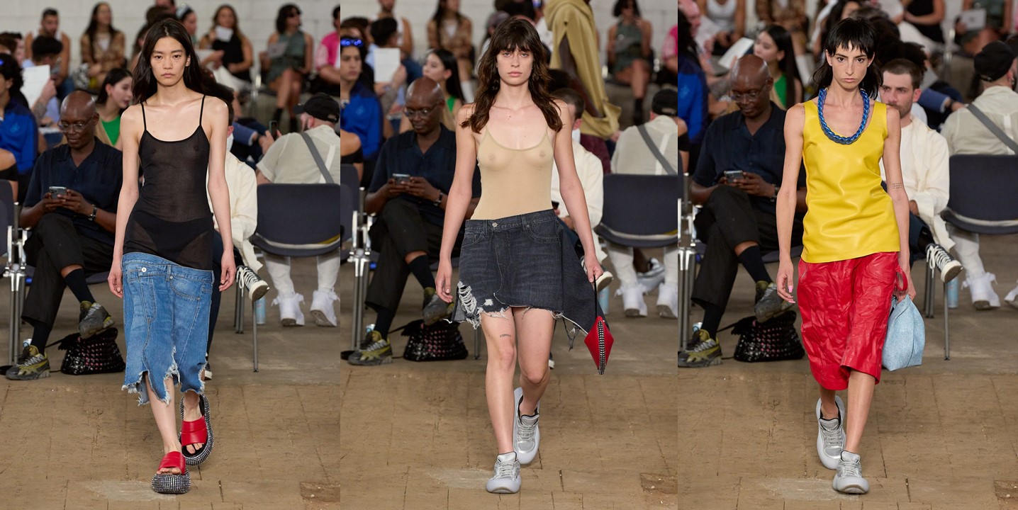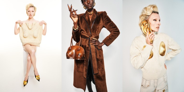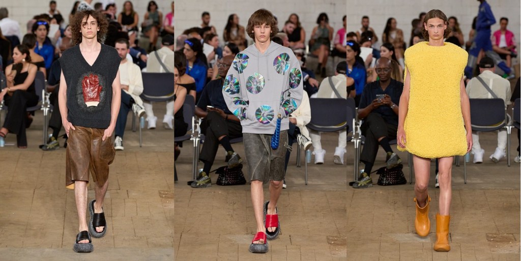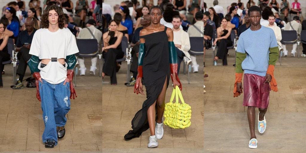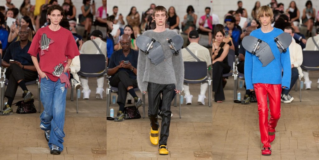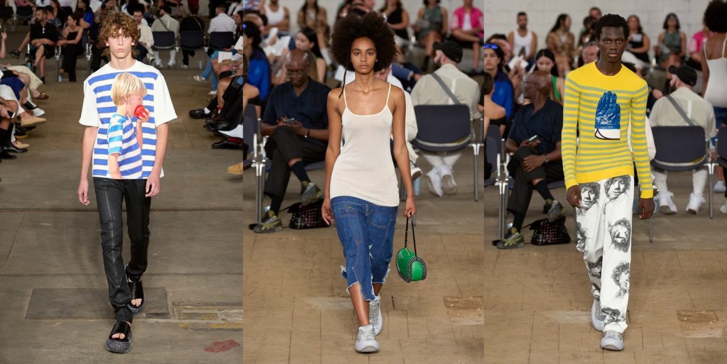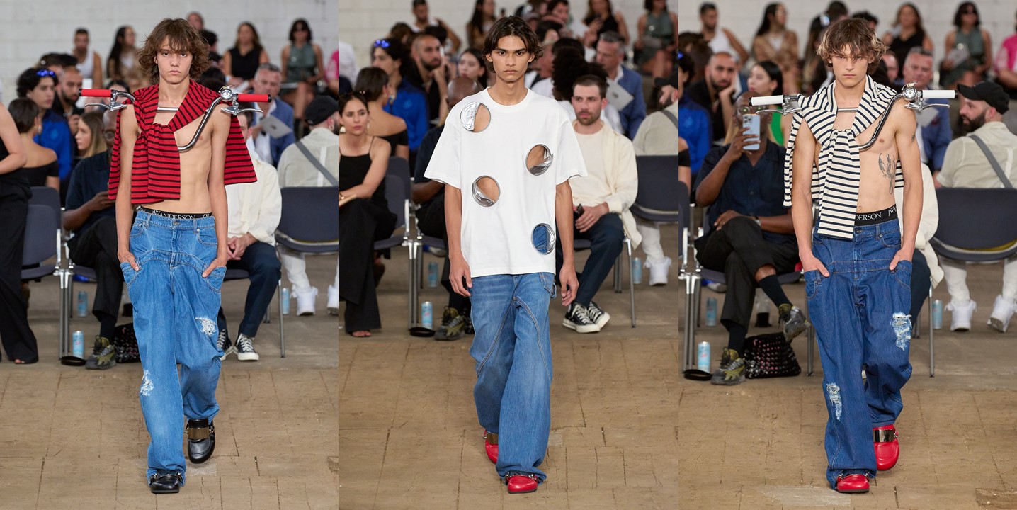 Jonathan Anderson is nailing it again, being in his surreal element. Back before Anderson started producing his in-your-face de-gendered mood-driven menswear in 2008 – the “shared wardrobe” concept that ironically led to him being practically frogmarched by his fans into expanding into in-your-face de-gendered mood-driven womenswear a few years later – he had plans to be an actor. That plan changed during an audition for Juillard in New York, where he performed a piece from the in-your-face ’90s play The Pitchfork Disney by Philip Ridley. Nearly a decade later The Pitchfork Disney, which he recently reread, was revived by Anderson as a central element in this first live Milan bow. Anderson said afterwards he’d been moved by “the shock of theater” that the play represented (some of the audience at its premiere in 1991 fainted) to shape a collection that tested our perceptions of clothing and modernity. The BMX handlebars, shattered skate decks and CDs were there to remind us of the intrinsic ephemerality of modernity, and its inevitable descent into anachronism. Anderson tried to add “eating canned goods” to this category of faded fads while speaking to the Italian press, but these pieces seemed more like witty acts of wearable assemblage. There was certainly a cheekiness to the project. The embedded bar codes made consumption provocatively both the ends and the means of engagement. “Fashion is a very modern device,” he said. “But it is not a modern act.” To underline the illusion of modernity he cast Rembrandt as the protagonist in his fashion play via intarsia reproductions on knitwear and prints on sneakers featuring the artist’s leery etching, Self-portrait in a Cap, Wide-eyed and Open-mouthed, from 1630. The nearly 400 year-old selfie stressed that while technology upgrades, the way in which we use it stays pretty constant. All these devices – along with industrial gloves, a stock photo of an apple-eating kid, and hardware-store door hinges – were placed within or adjacent to borderline generic contemporary canons of clothing. This created a have your cake and eat it result: you could wear JW Anderson-issued versions of 2023 uniform, and through those in-your-face interventions included within them simultaneously signal that you understood the narrative was entirely contingent – just a wearable moment in time.