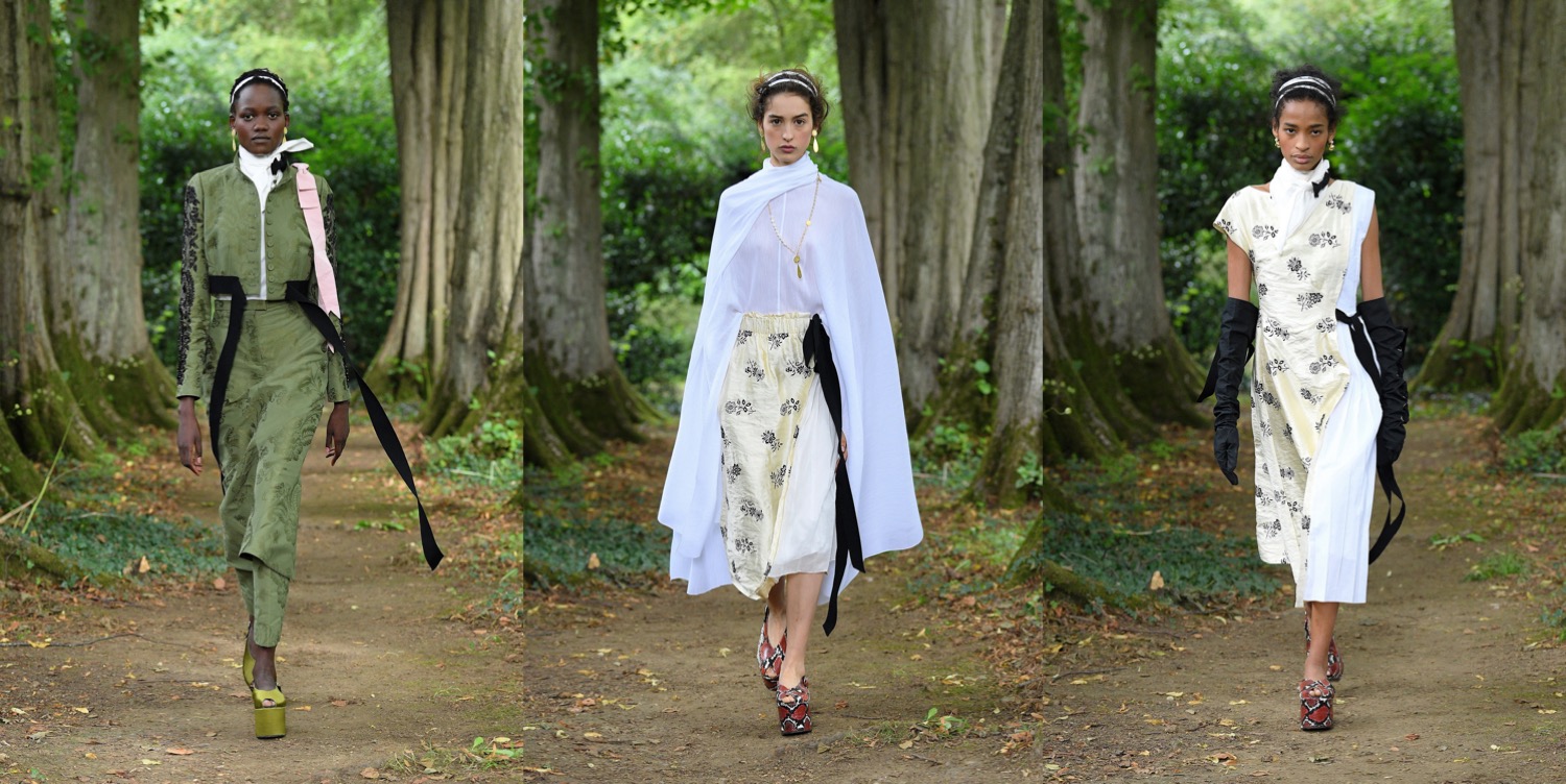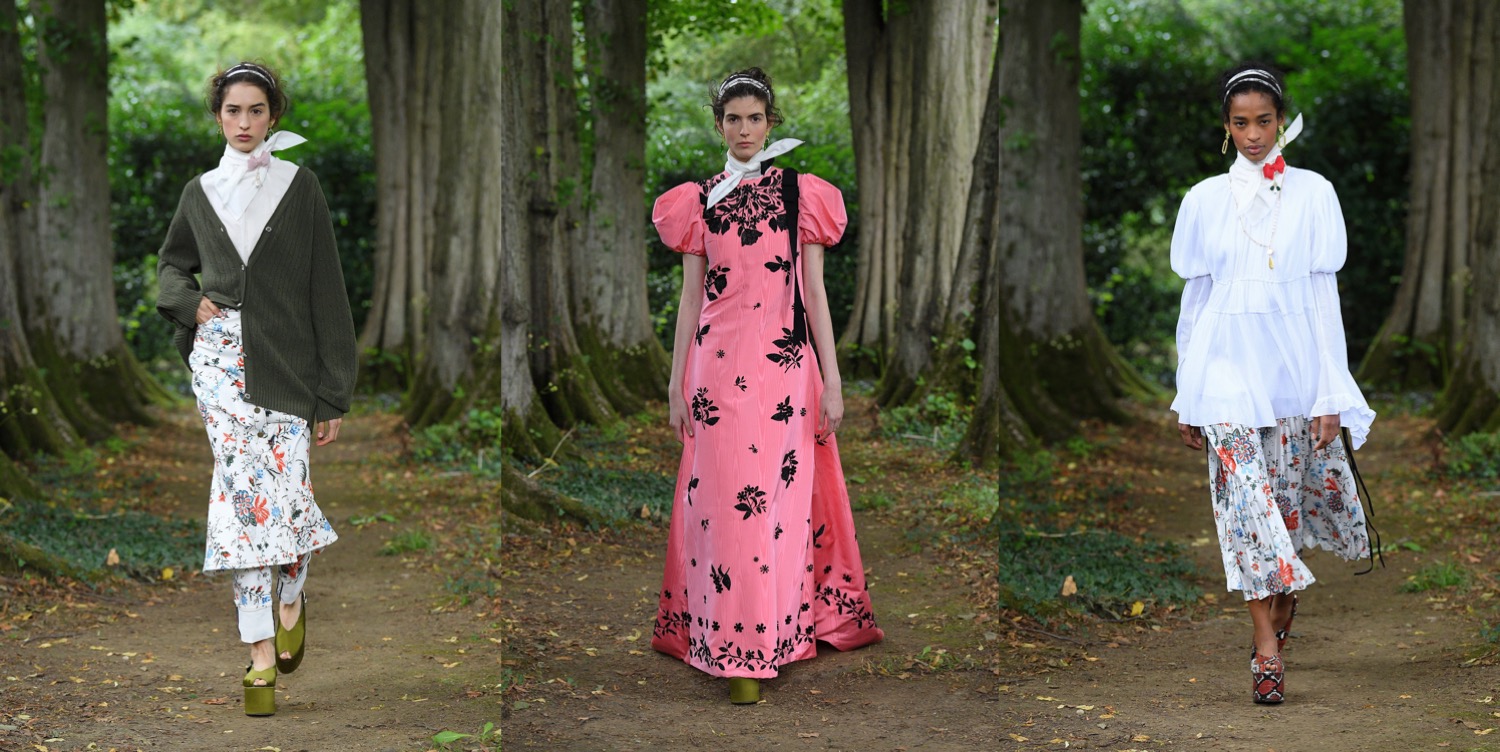 In Erdem‘s world, nothing has changed – at least, at a first glance. Here, women are still dressing up and wear magnificent dresses that have a romantic, elegant side. But the period of confinement did have an impact on Erdem Moralioglu. It reads like a mad experiment: Erdem Moralioglu in his London house for four months, with denied access to the museums and libraries that oxygenate his storyteller mind, and throw in a Susan Sontag novel. “It begins with three people dancing on the lip of a volcano,” the designer said of the collection he authored and drew in quarantine. Inspired by The Volcano Lover, Sontag’s portrait of the 18th-century beauty Emma Hamilton, who married a volcanologist obsessed with Grecian vases and had a passionate love affair with Lord Nelson, this was how Moralioglu coped with everything that happened this spring. “There was something about this odd time that we’re living in, and the idea that there is something so much bigger than all of us that controls everything,” Moralioglu said, drawing a parallel between crises past and present. “It’s beauty in a time that’s very ugly, and the idea of creating something decadent with an underbelly of something poor.” He expressed that sentiment in a meeting between formal and informal: a trans-historical voyage that referenced Grecian nymph shift dresses through the lens of the puff-sleeved empire silhouette, a sprinkling of Nelsonian regalia, and a cameo by Susan Sontag’s post-modern cardigan. Many of his embroidered muslin and organza dresses and 18th-century floral jacquard numbers were treated with crinkling effects to evoke a sense of “poor,” which means something quite different in Moralioglu’s dainty world than it does to the rest of us. But within the folds of those fabrics, there was a feeling of resourcefulness, which illustrated the idea of beauty in a time of uncertainty. Some pieces looked as if they’d been spliced with other pieces, Nelson’s admiral jackets and grosgrain regalia had a scent of thriftiness about them, and opera coats seemed to morph into khaki utility-wear. Then, a sturdy denim bottom popped up, posing as a chic pencil skirt. But still, Erdem is all about eveningwear. “I get asked the same question: Are women’s tastes and wants changing now, given the situation? On the contrary, we have a customer who’s still buying special pieces. It’s the want for something you can wear in five and 10 years. As I enter my 15th year doing this, the most thrilling thing is seeing someone wearing your work from 10 years ago. I’ve always been obsessed with permanence,” Moralioglu asserted. “When it feels like the end of the world, doesn’t someone need a pink moiré hand-embroidered gown?”