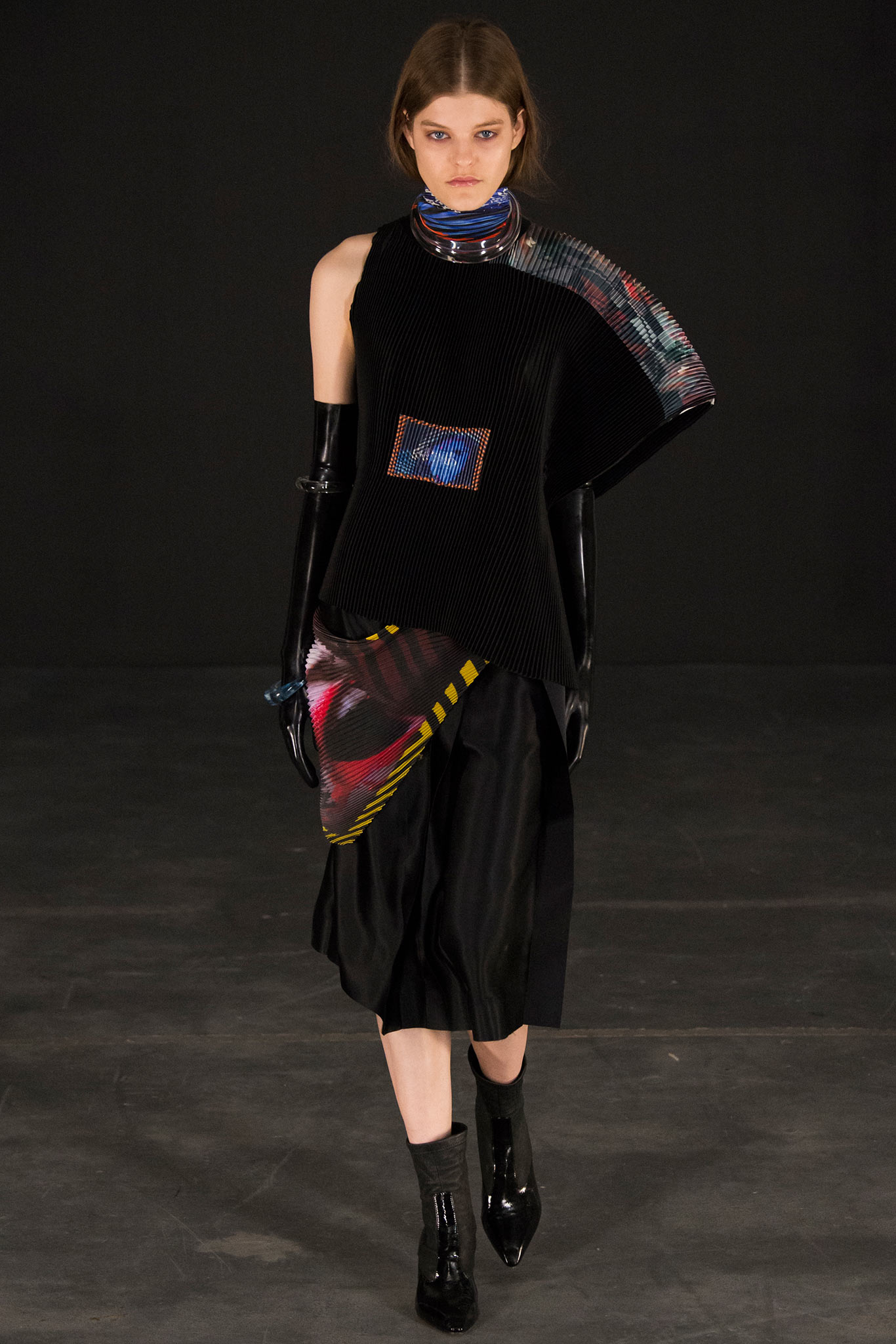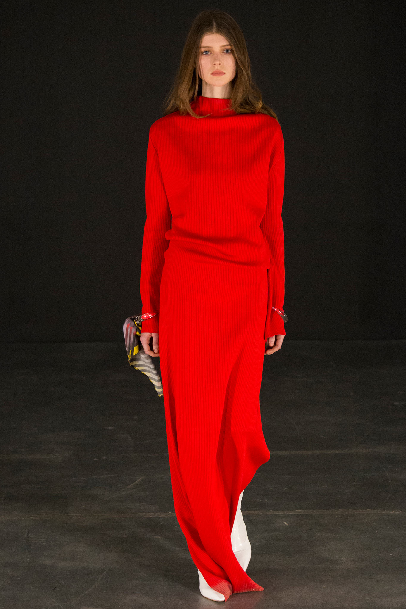 In all that highly feminine, yet commanding mood the designer is channeling and refining in her latest offerings, an assortment of no-nonsense, investment-worthy garments: a drab olive-brown jacket with a high, chin-grazing collar styled with matching pair of knitted panties; sensational outerwear in broad-shouldered cut; pleated, wool pants refined by the designer to perfection. But there’s also place for unabashed glam: the eternal style of Milanese sciuras unexpectedly dialogues with the unsung chic of Old Warsaw’s starlets like Zula through a retro-imbued overlap that comes evident in faux fur stoles wrapped around the shoulders, worn over seductive, ruched dresses with built-in corsets. Meanwhile, the two finale pieces of the collection are hooded black dresses in either above-the-knee or floor-sweeping length. They intrigue with minimalist sharpness of cut and the seductive depth of plunging necklines, subverting monastic connotations. As usual in case of Butrym’s style vocabulary, there’s a charming nod to her Slavic heritage. For resort, it comes in form of hand-made lace from Koniaków which is very proudly used in a crocheted body with sharp shoulder-pads, an apron-like skirt, shopper bags, and next season’s ultimate it-accessory: bonnets.