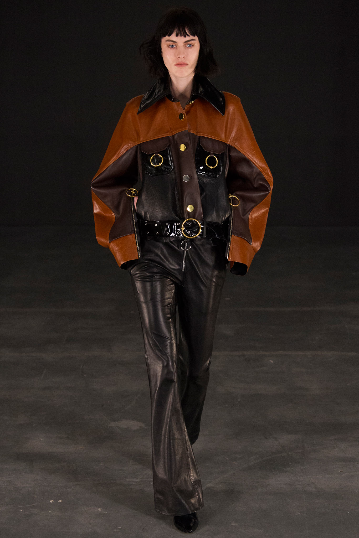 There’s an appealing, sensually charged toughness about Magda Butrym’s collection for resort 2025. The Polish designer’s smokey-eyed and red-lipped glamazons are in a dreamworld, but one that isn’t a saccharine wonderland. A sense of enigmatic chic informs the entire line-up, blurring the lines between daywear and eveningwear, feminine and masculine, precious and utilitarian. The collection’s brave, tough chic mood finds inspiration in cinematic depictions of women in West Berlin during the late 1970s, from Luca Guadagnino’s “Suspiria” remake to Andrzej Żuławski’s “Possession“. The first, a perplexing story of a witchy dance school and its female-only cadre and students, informs the collection’s color palette. Rusty-tones, overcast-greens and earthy-ecrus meet intoxicating blood-red – the color of lipstick on the pale faces of Madame Blanc’s dancers, and their nail polish, and the unsettling interiors of the Tanz Akademie. In Possession, the high-pitched fever dream directed by the renowned Polish provocateur, Isabelle Adjani’s character Anna – entangled in an illicit, forbidden romance – storms metro stations and soc-realist neighborhoods in utilitarian, yet feminine dress-coats. These two so female-centered films deliver an unobvious outlook on women, their emotions, sensuality, and most importantly, their sacred power. The lookbook, photographed by Vitali Gelwich, was captured inside Warsaw’s iconic Dom Pod Orłami (“House Under Eagles”). This modernist pearl keeps in its thick, marble walls many untold secrets, from pre-war bank affairs to wild raves of the 1990s. Who knows what rituals happened down these long corridors and hidden staircases? The brute, monumental beauty of the building charges the lookbook with certain mysterious, elusive, even esoteric ambience, one that can be perceived in Guadagnino and Żuławski’s cinematic universes.