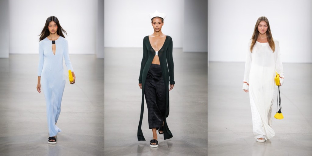 The clash of 90s minimalism with her Ukrainian heritage is Svitlana Bevza‘s signature style at her New York-based brand. “Due to the separation of the pandemic, it’s important for us to show something very Ukranian historically,” the designer told Vogue. Her main inspiration was Olga of Kyiv, who ruled in the 10th century and is known for her revenge on the people who killed her husband. The knit balaclavas, one of which opened the show, were inspired by Olga’s iconography, but for the 21st century they were paired with matching blazers and knee-high leather boots. Bevza also incorporated the image of the spikelet, a symbol of good harvest and an optimistic year. Last season the label introduced spikelet earrings; this time, subtle, grain-like shapes appeared in the boots, caped dresses, denim skirts, and in the chunky fringe adorning some of the knits. With mustard and slate blue livening up the typical Bevza color palette, the sophisticated and soft silhouettes spoke to life at home. As Bevza said, “It will last for a while that people are at home with no parties, but we have to feel and see ourselves beautiful in the mirror.” That’s the smart take-away coming from most designers we’ve seen so far this season.