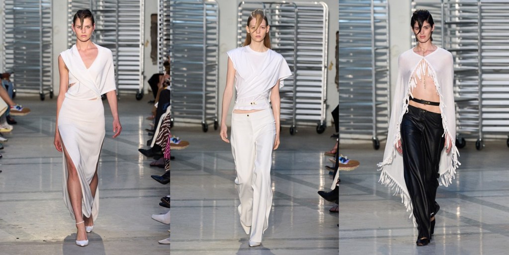 Bevza also used the runway as her platform to showcase one of the biggest issues affecting Ukraine right now: wheat. The theme was already baked into the setting: Large wheeled trays with loaves of bread dotted the corners of the space. Ukraine is considered the breadbasket of Europe, and wheat is embedded within the country’s customs. “When you’re making a proposal to marry somebody, you bring bread with you. When you’re going to somebody’s new home, you should always bring bread,” says Bevza. “Even when you’re saying goodbye to the dead, you used to bring bread.” Currently, there is a crisis: fields of wheat are being destroyed by Russian missiles, and that’s predicted to have harrowing effects on the world’s wheat supply for months to come. The importance of the grain was translated through the use of wheat spikelets. Even before the war, Bevza produced spikelet necklaces and earrings. This time, that golden spikelet necklace was blackened, symbolizing the burning of the wheat fields. Silk skirts—paired with itty-bitty bandeau tops – boasted an elegant hourglass silhouette thanks to how the fabric was gathered at the sides, a nod to how Ukrainian women centuries ago would gather wheat in the fields. Ukraine can be a tricky place for designers to define themselves; some heavily use Ukrainian traditional motifs in their designs, and others opt to go their own way sans any reference to their roots. Both choices are of course fine, but Bevza possesses the stellar ability to seamlessly translate her homeland – and its crisis – through a contemporary and, in this season’s case, very strong lens.