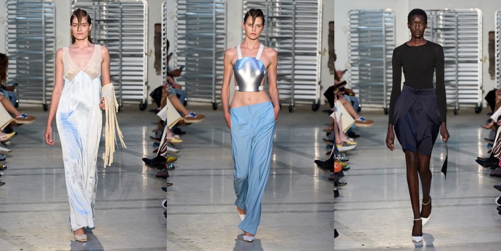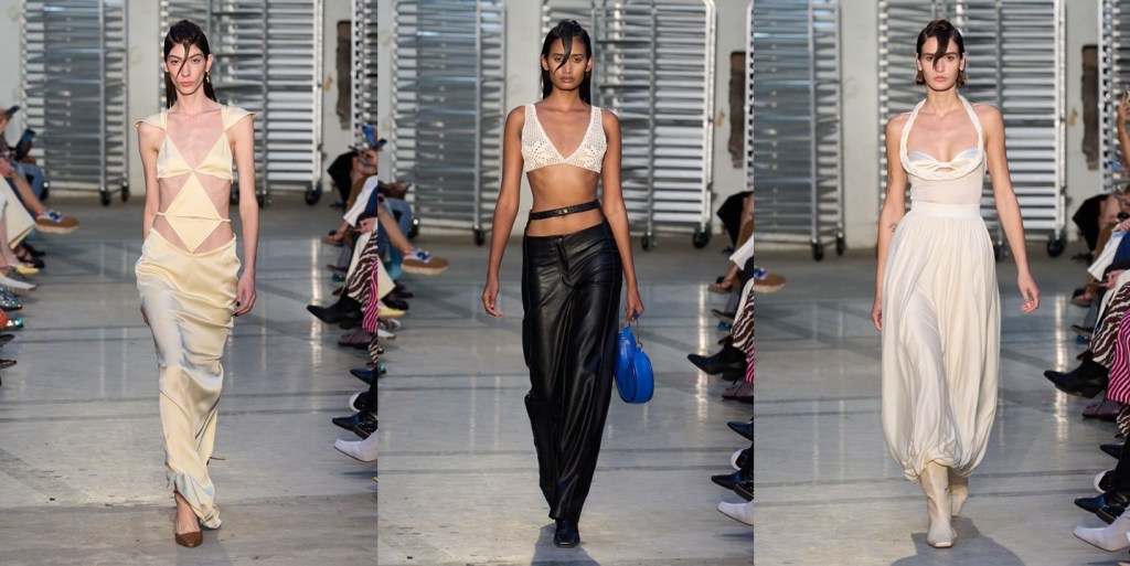 The Bevza staples: a slinky, ab-revealing dress; a white slip; and a muted color palette. For spring-summer 2022, Svitlana Bevza emphasizes her label’s classics. Bevza was inspired by her own archives as well as the ocean. The latter allowed her to experiment with seashell bra tops, sailor scarves and hats, and wavelike seams adding texture to the body of dresses. The distinctly nautical details were charming. There’s also the sustainability factor: the boxy necklines of some pieces were meant to resemble plastic shopping bags, for instance, and several of the square patchwork dresses were made from scraps of fabrics in Bevza’s studio. Those frocks were quite appealing: they moved gorgeously when worn and had a subtle complexity that revealed itself the closer you got to the garments. This collection is for all the sun, sea and sand babes out there, ready to spend their time at the beach all day, all night.