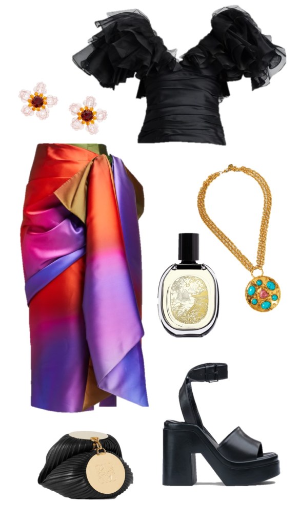 Simone Rocha crystal flower earrings, Khaite ruffled chiffon and satin, Christopher John Rogers gradient evening skirt