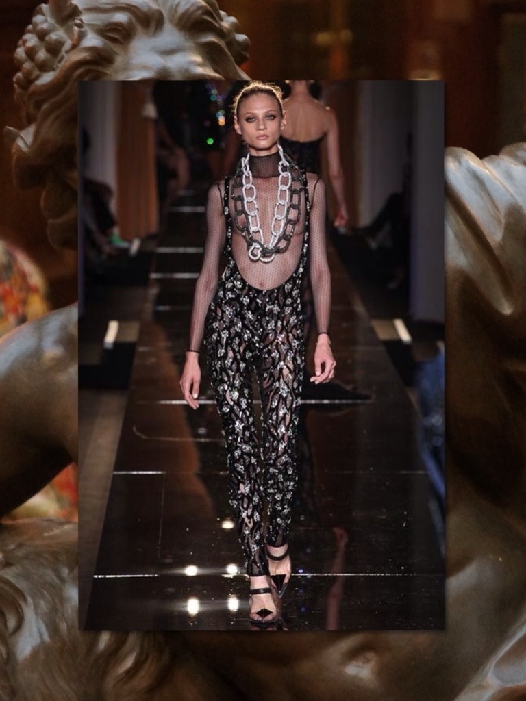 This collection wasn’t about shitty minimalism but is propagated by Dior, or cheap looking wedding dresses by Chanel. The details- crystal hooks, fur, amazing tailor ship, best quality. And a cat suit that plunged down to Lindsey Wixson’s navel was paneled from lace, net, and handwoven leather. That piece was the least thirties-ish of the lot, but all of the models wore real diamond jewelry designed by Versace. I feel the Gianni spirit here!!!