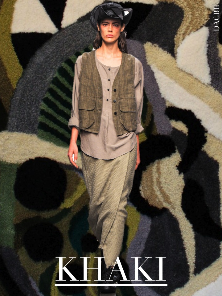 Khaki is a movement of military trend although this season, it’s much more calm and elegant. V-neck sweaters, bomb dresses, artsy tracksuits and leather coats are the thing for active summers in forests. Khaki, in overall, is a cool colour. Creatures of Comfort, Sonia Rykiel, Marc Jacobs, Chanel, Hermes.