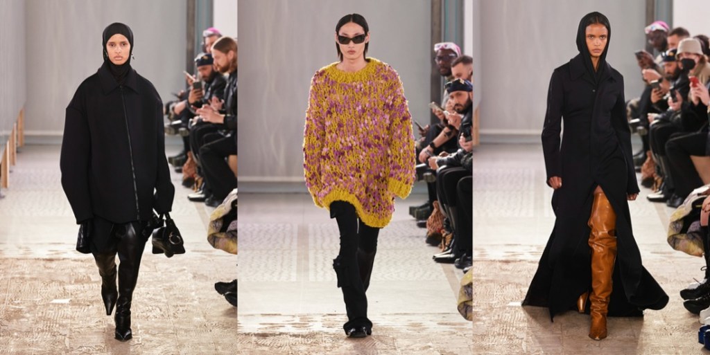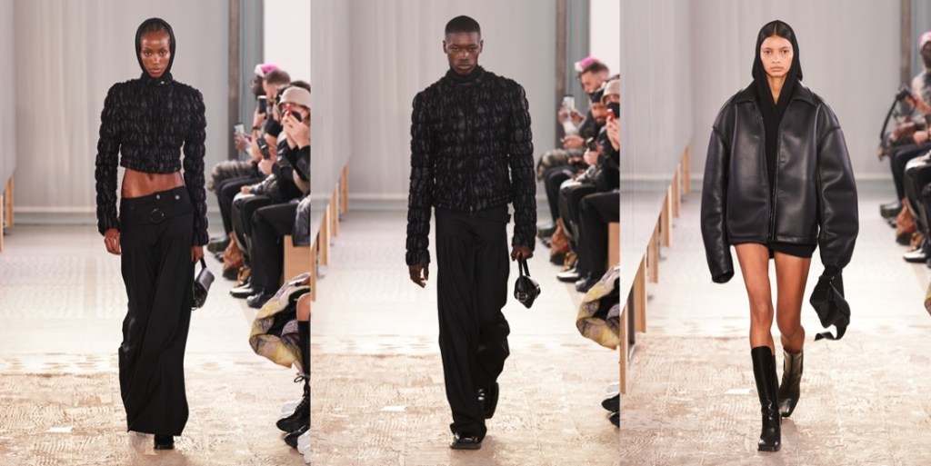 One year in at Trussardi, and it seems it’s clear what Benjamin Huseby and Serhat Isik are up to with the Italian brand. The latest collection is an ode to the Milanese style that made Trussardi prominent between the 1970s and ’90s. It all started with the puffer jacket, taken to the extreme to become XXL, like a bathrobe, padded and super soft. The leather on men’s and women’s skirts was distressed, softened, while the duchesse silk and nylon imitated the leather on classic cut blouses and less classic skirts with diagonal zippers. Everything read “sciura,” a Milanese term for the typical city lady, who only wears black, hazel, ecru and bordeaux, as in this collection, allowing herself to wear a jacquard motive that is reminiscent of the tapestries in the palaces she frequents. Isik and Huseby played with these clichés without mockery, rather using them as a key to a brand story that would otherwise be left untold. The final look was a mermaid skirt paired with a jewel belt and a sober turtleneck, completely black. It was like a contemporary version of the Trussardi look for the Teatro alla Scala premiere, an unmissable event for the typical Milanese. However, is this (quite convincing) storytelling enough to turn new clients on to buying Trussardi?