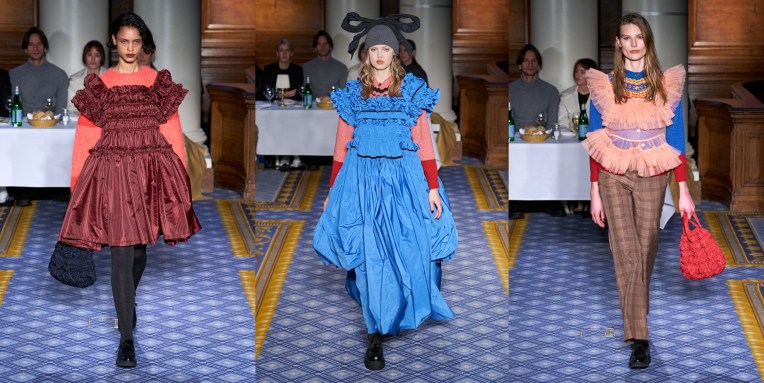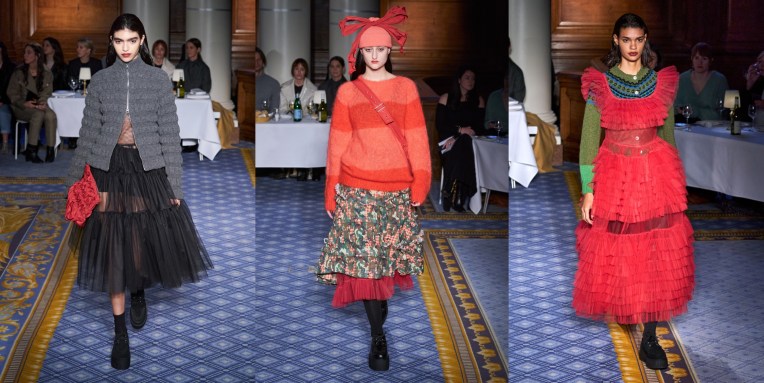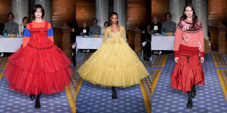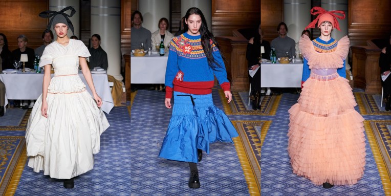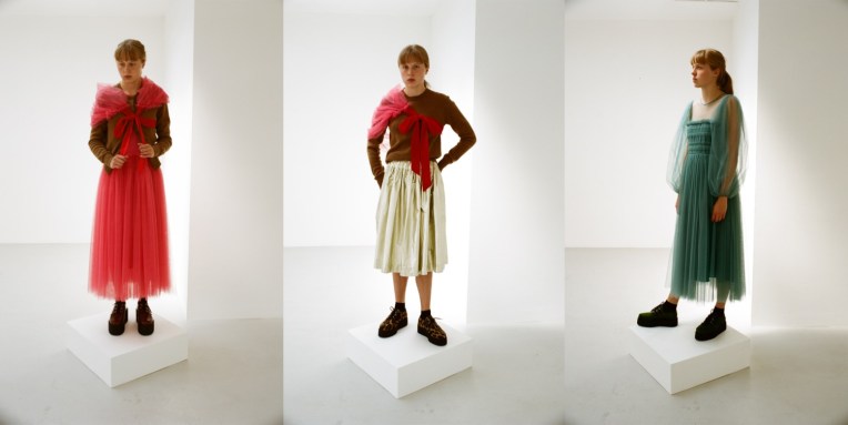 The designer’s lineup for spring includes a recently launched category called Atelier, under which she’ll produce one-of-a-kind pieces. Each garment is made in Beirut in her atelier using couture techniques. Merhej said that now that she’s established the commercial portion of her business, she wants to make sure she continues to push herself creatively, while at the same time finding ways of nurturing the decimated fashion industry in Beirut, currently in a state of rebuilding. The pieces are also sustainable in that they’re made from deadstock materials. The first of these pieces opens the lookbook: a naturally dyed cropped cardigan knitted in a large gauge with mohair and tulle yarn by Lindsey Smith, a collaborator. “The idea was to create these kinds of knits that look like they’re degrading, the leftovers of her dress that was falling apart,” Merhej said in reference to her princess and her arduous journey. Another piece is made by hand layering pieces of lace her mother has been collecting for 25 years. The most striking item in the collection is a reversible coat as seen in looks 3, 7, and 9. One face is taffeta, and the other is covered in gathered tulle. The coats underwent a few experiments like tea dyeing or sun drying, all to give them the texture and softness of a lived-in piece. Elsewhere, in the ready-to-wear, Merhej explores her tulle fabrications, most notably on a skirt made of cotton and covered in tulle, which she also designed attached to a ribbed knit top as a dress. Other highlights include ankle-length linen skirts, a pleated button-down shirt fitted at the waist (a common focal point in Merhej’s work), and a rounded kimono-sleeve tailored jacket, which is returning from last season given its success. Again, this is a truly beautiful collection, with subtle echoes of 1990s Comme Des Garçons and Romeo Gigli.