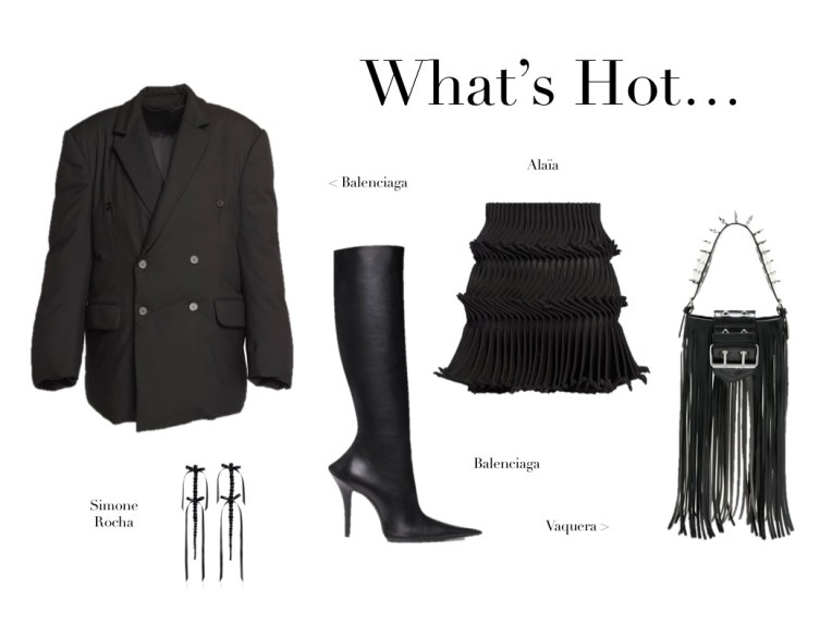 Backstage at their Vaquera fashion show on the first day of Paris Fashion Week, Patric DiCaprio and Bryn Taubensee were talking about dreams and nightmares, and how they can become interchangeable as time goes by. “We’re excited about selling commercial things,” DiCaprio said. “But I think this season we weren’t afraid to make things that weren’t necessarily for sales, and to say that that is an integral part of our brand.” Take the fun silvery sequin dresses or the various iterations of the wedding dress. I mean, wearing Vaquera on that special day is quite a statement. Other non-commercial garments were the jeans studded with blunt-ended nails which reportedly weigh a couple of kilograms. Mixed in amongst those punkish pants were more readily wearable pieces in the form of army sweaters and nylon cargos, and a faded black leather peacoat and pants. In the early New York days of Vaquera, back when the brand had a more conceptual direction, they designed polo dresses with pointillist renderings of their designer heroes, Vivienne Westwood among them. She was present in their latest show via an updated version of her infamous “tit top” with twisted and tucked “nipple” details. She’s the proof that you can mix business and non-conformity.