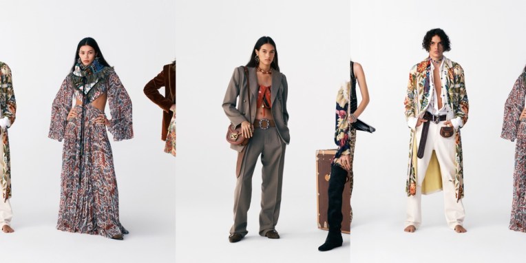 Meanwhile, for resort 2023, Veronica focused on the classic summer-version of the brand. The label’s staples – the glamorous caftan, the dressing gown duster, the flowy dress – were given a fresh interpretation. The paisley motif was blown up into a vibrant abstract rendition, printed on a long chiffon dress with butterfly sleeves, or onto a masculine bermuda suit, or again on a tight body-con number with an asymmetrical ruffled hem. Punctuating the collection with an artisanal feel, a series of crocheted pieces including an elongated mesh cardi, a handknit knotted-fringed miniskirt, and a show stopping robe/poncho exuded the haute hippy vibe that is trademark Etro. Its free spirited attitude will surely transition into Etro’s new direction.
