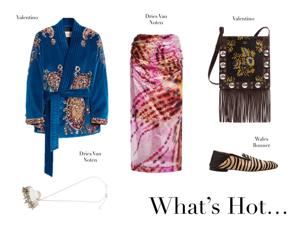 What’s Hot (18.1.25) January 18, 2025January 12, 2025 | Design & Culture by Ed Get the look: Loro Piana Raniya Belted Macramé-trimmed Cotton-blend Velvet Jacket Valentino Nellcote Suede and Jacquard Fringe Crossbody Bag Dries Van Noten Asymmetric Ruffled Floral-print Cotton-poplin Skirt Wales Bonner Suede Classic Slip-On Loafers Dries Van Noten Gold-tone Beaded Necklace