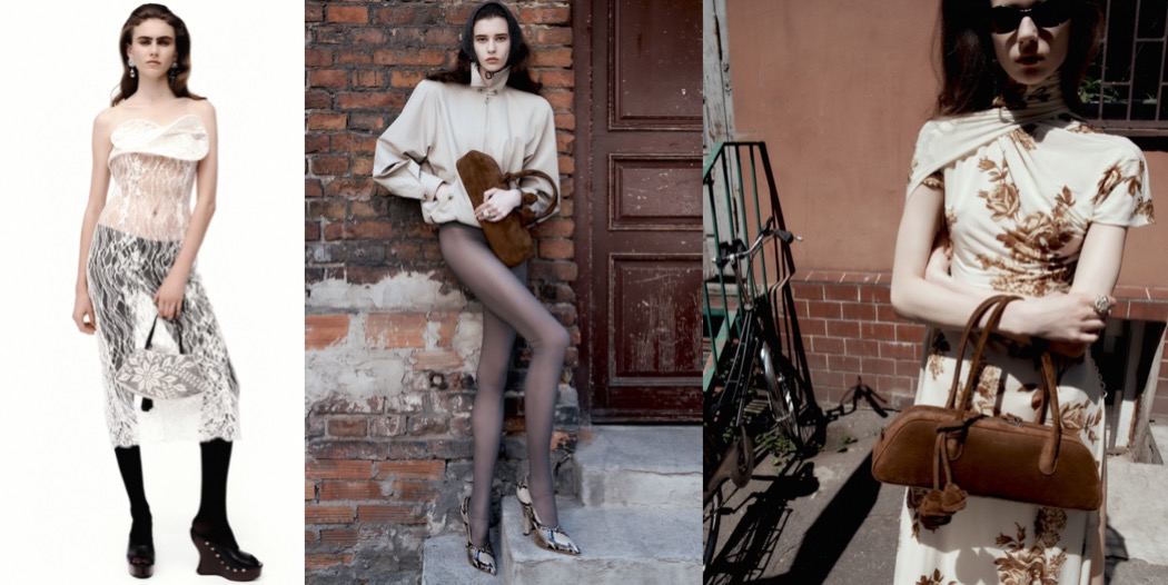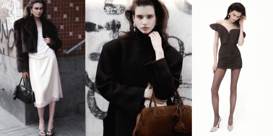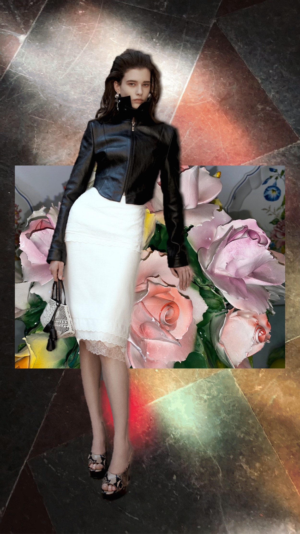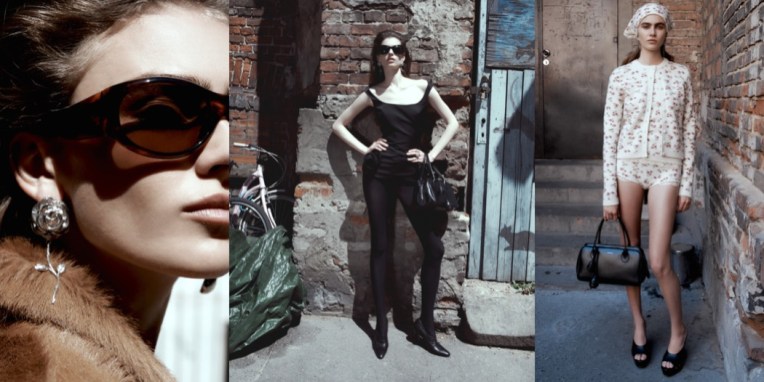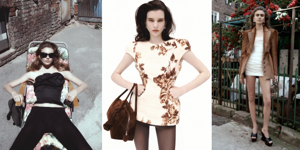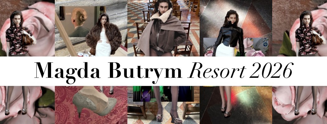 All dressed up and brimming with attitude, the look-book’s nearly cinematic heroines lounge on upholstered deck chairs, stride through the lively streets of Praga-North, and revel in the hidden, picturesque corners of the rough-around-the-edges quarter. The narrow silhouettes – accentuated by shoulder-padded, hourglass-shaped pony-hair jackets and knee-length skirts – are offset by the utilitarian energy of heavy-duty leather bombers and a slouchy rose-red tracksuit. Hip-padded mini dresses boldly reveal flesh, while shaggy boleros and voluminous masculine coats offer a sense of protection. A floor-sweeping crimson dress with a dramatic back slit is finished with a vintage-inspired flower necktie, its petals subtly shredded. Beneath the collection’s rich textures, artisanal details, and lady-like decorum lies a raw, risqué energy- sexual, liberated, and unapologetically bold.