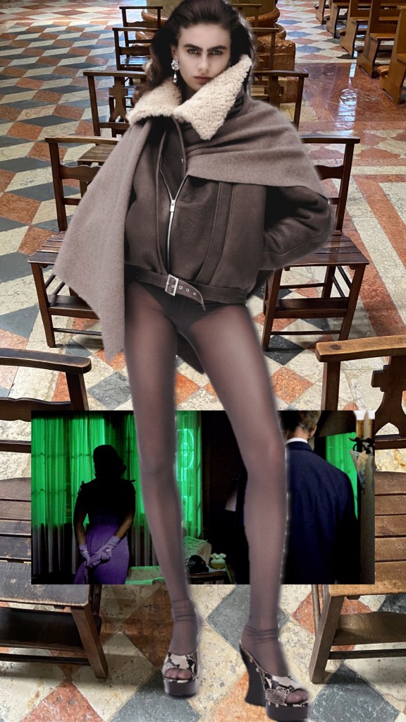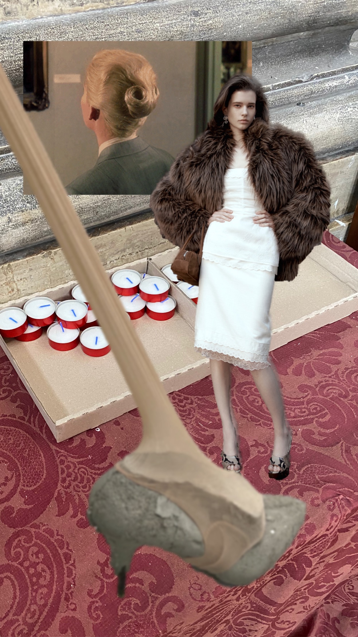 The look-book thrives on an unexpected, magnetic tension: rose gardens blooming amid brutalist surroundings, sacred icons of Saint Mary tucked away in shadowy alleys. It reflects the designer’s vision of ambiguous femininity – glamorous and “perfected” at times, yet coarse and grunge-tinged at others. That sensual duality is especially vivid in this season’s leg-centric silhouettes: curved wedges and semi-sheer, tights-like trousers evoke a strong, sculptural attitude, inspired by one of Sarah Lucas’ tapering artworks made from stockings stretched over wire and anchored by concrete high heels. The season’s eveningwear – structured in body-morphing forms and elevated through exaggerated silhouettes- also nods to the British artist’s crude, unfiltered approach to the female body. Lucas’ provocative vision of womanhood fascinates Butrym – and inspires in rethinking contemporary femininity.
