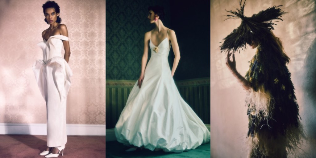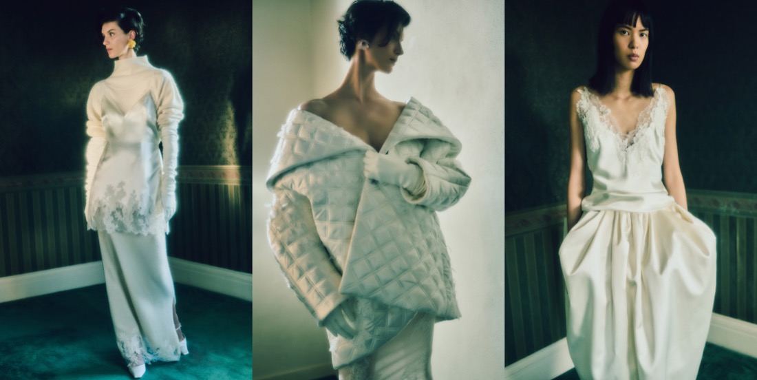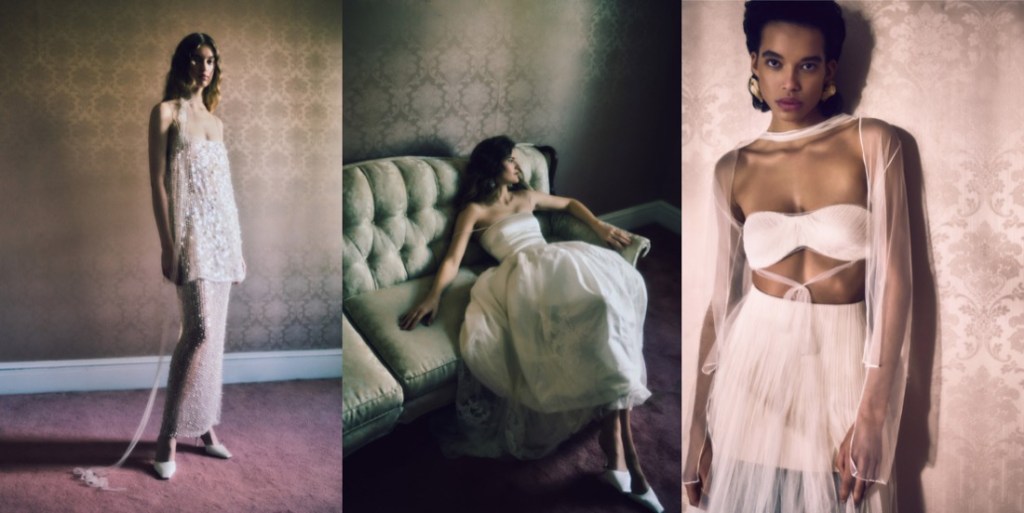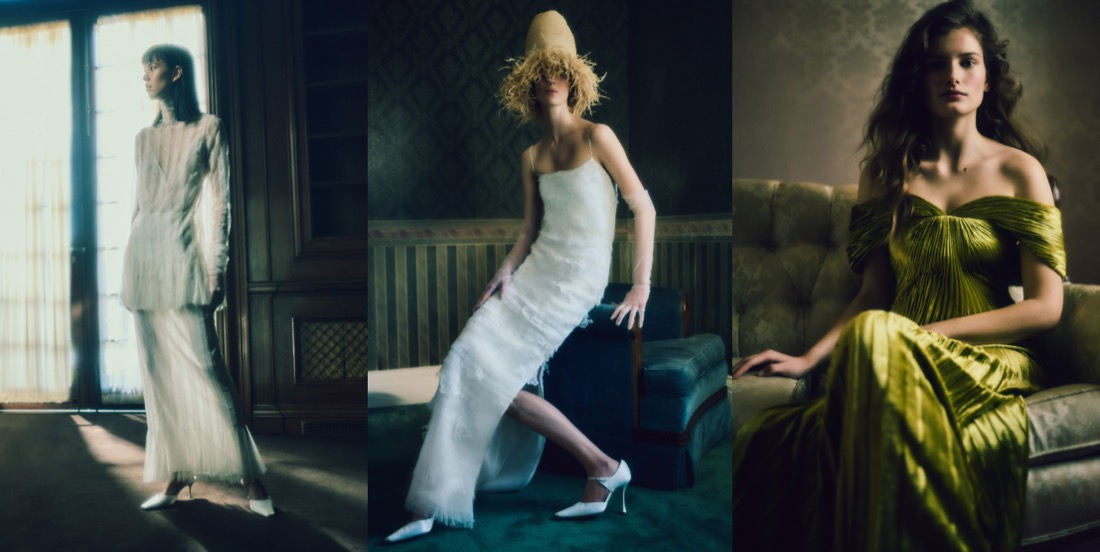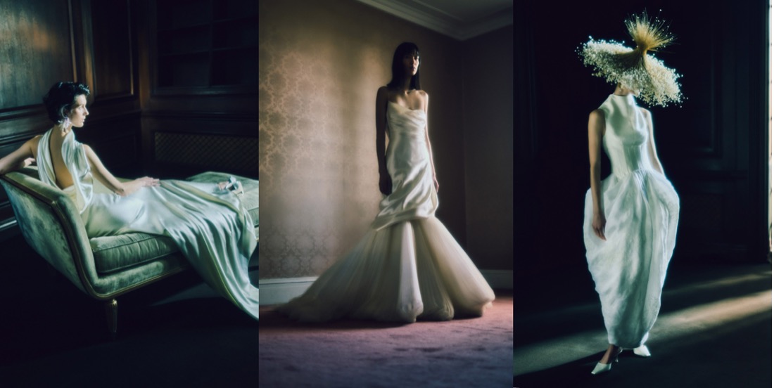 If there’s one designer that leads the bridalwear game today, then it’s definitely Danielle Frankel and her New York-based studio. However Danielle isn’t limiting her designs to weddings only; she describes her namesake brand as “a fashion label” whose “medium is bridal,” a minor yet important distinction that indeed manages to capture her stunning creative output. The latest collection, starring Italian beauty Mariacarla Boscono and styled by Vanessa Traina, is an in-depth study of texture, unique fabrications, and gesturally arranged flowers lead to a sort of accidental Impressionism. The brand’s signature interplay of hard and soft and its relaxed refinement join pointedly feminine details that are naturally mussed at the edges. Oil-on-canvas landscapes are interpreted by hand-painted petit-fleurs, watercolor prints, and sculpted blooms. Painterly brushstrokes adorn featherweight organza juxtaposed by castings of metal and clay blossoms created by artisans in Ukraine and South Africa. The introduction of silk jersey brings a goddess-like liquidity to the range, while the addition of Lyon lace elevates an exploration of sheerness and structure. Silk woven with metal fibers creates beautiful wrinkles that are meant to last rather than be pressed away; a sort of “perfect imperfection“. In a continued exploration of color for the aisle, alabaster is joined by patinaed rust, hibiscus, citrus, pale chrysanthemum (Frankel’s favorite) and various shades of ivory. Degradé-dyed and pearl-tipped organza fringes mimic grasses in the hand-brushed expanses that inspired them. This really isn’t your average bride-to-be wardrobe.