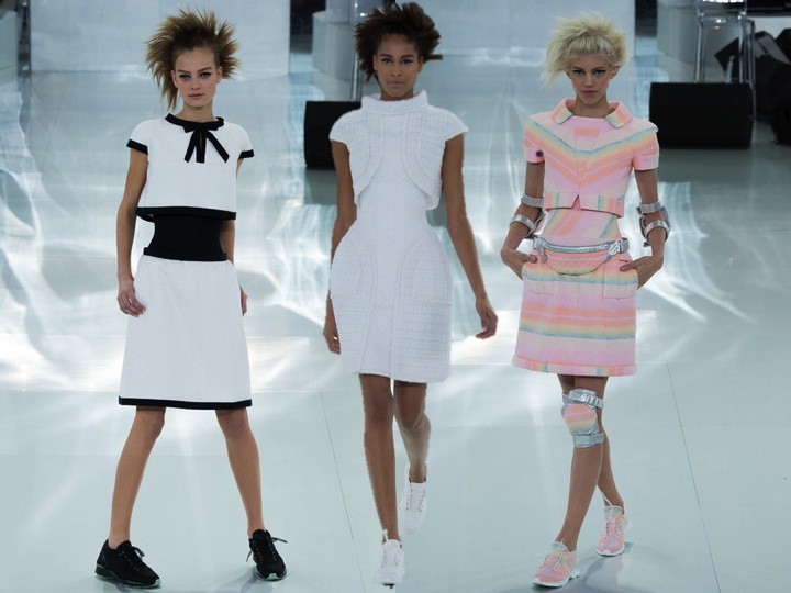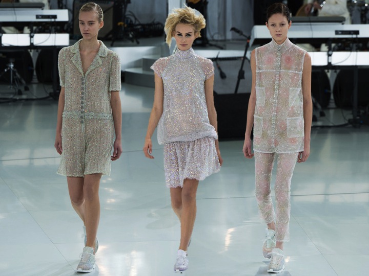 Karl Lagerfeld again cleared it all straight away- he is the innovator of Couture as every season. The SS14 was so… Feminine. Soft. Girlie. Innoncent. There are hundreds of words that may describe this amazing collection. First of all- no more heels on couture. ONLY SNEAKERS now count. Just like at Dior, but in more cooler way. Cara Delevigne was a beautiful bride in a white wedding gown (that was unexpectly very modest and comfortable!), hands-to-hands with a small boy who looked cute in a tiny Chanel suite. The collection was inspired with sporty chic (that’s why the embroidered trainers and knee defenders) and the simplicity of beautiful dresses- forget long gowns. Now it’s time for mini-dresses and sheer bodysuits. That was a really lovely collection.