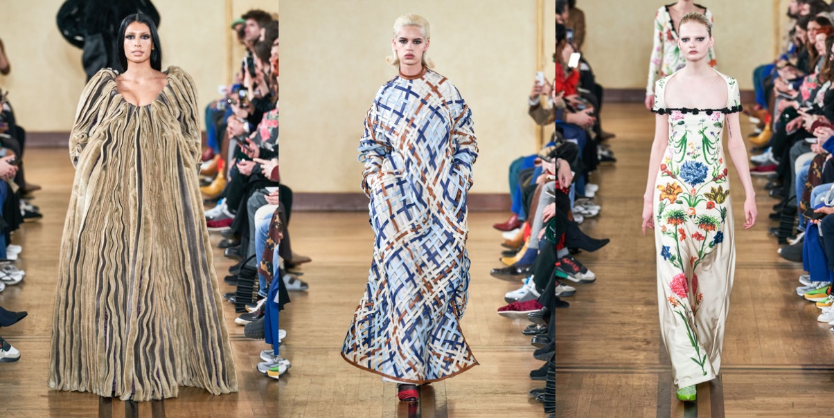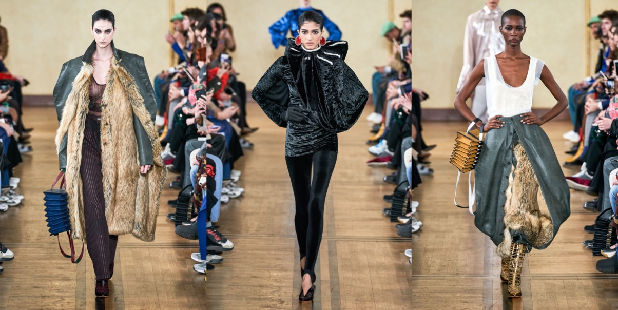 Similarly to this season’s Paco Rabanne, Y/Project was ‘overfilled’ – but in a good way (even if this sounds strange). Glenn Martens took the old school glamour archetypes, reworked them, and delivered something pretty much madly fashion. He jumped from a superchic tweed coat with faux fur and Turkish rug inserts to a long black satin skirt draped up from a pair of deconstructed pants. A pistacchio kimono coat-dress? Yes. A voluminous jacket with an A-shaped skirt that reminded you of weaved chairs that are all over the Parisian caffes? YES. The closing, XXL gown was so extravagantly billowy that you really wish to see it on the red carpet (Rihanna, take a look!). Martens likes to take risks. Also, he seems to be one of the few designers in Paris who really dare.