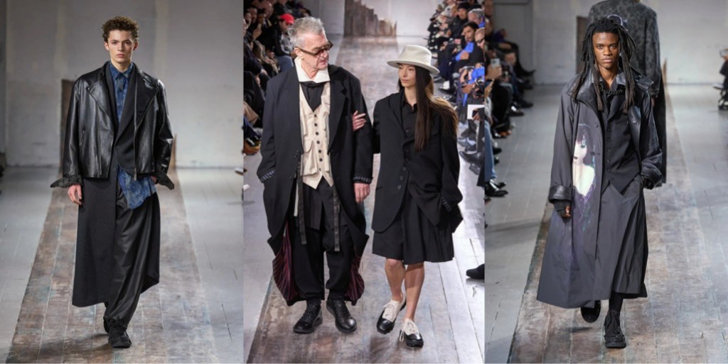 Yohji Yamamoto is designer with an endless fascination for artists – the individualism, the impulses, and the archetypes. From the loosely knotted poets’ blouse and a coat with peaked shoulders, to the sumptuous attire in velvet and brocade, this was a collection for that certain “genius working in the studio” person. Uniform of loose jackets and utility vests; shirts covered in vivid brushwork tucked into suspendered trousers. Dressed in these ensembles were some of his longtime artist collaborators – Wim Wenders and Max Vadukul – along with Warren Ellis, Norman Reedus, and the dancer Brandon Miel Masele. And while they appeared like distinctive personages, they also conjured some essence of the designer himself. For one of his two strolls down the runway, Vadakul donned a coat with “old bohemian” along the back. Would men consider this a badge of pride, a way of confronting reality with a smirk? “We’re older but that’s the only thing that changes,” the photographer acknowledged backstage. “What we create is still the same.” The show closed with Wenders in trousers printed with his name. Yamamoto and the filmmaker worked together in 1989 when the director made Notebook, a documentary about cities and clothes. Yamamoto noted how they were both children born in the aftermath of war-torn cities and have alchemized that darkness into work that has a poetic resonance. If the collection unleashed ideas with a sort of feisty enthusiasm, the pace was calm, and the mood was poignant.