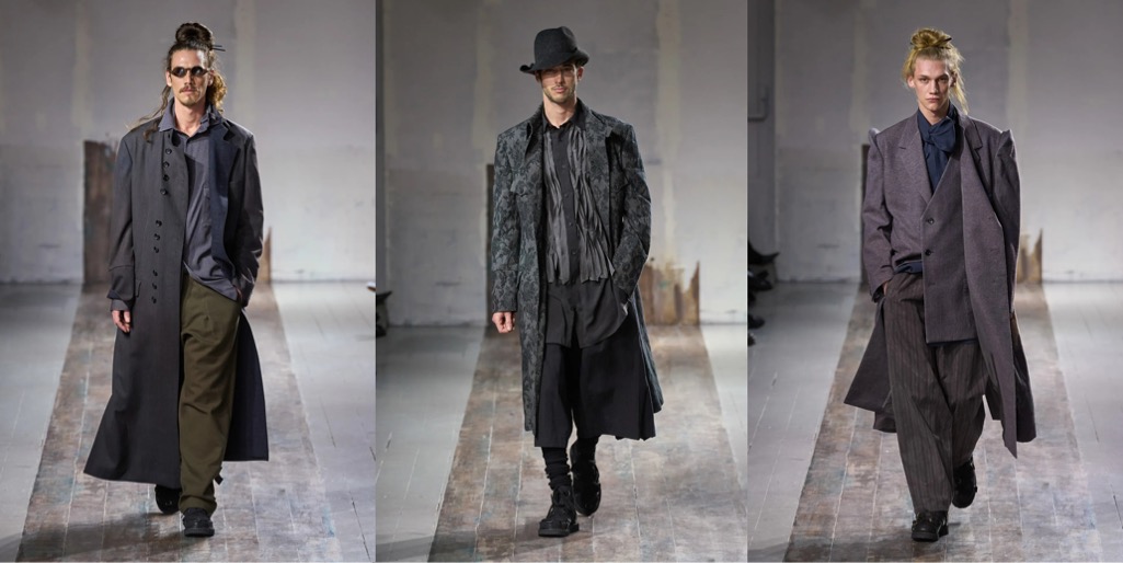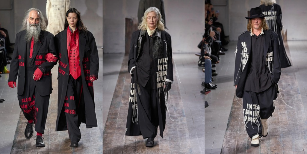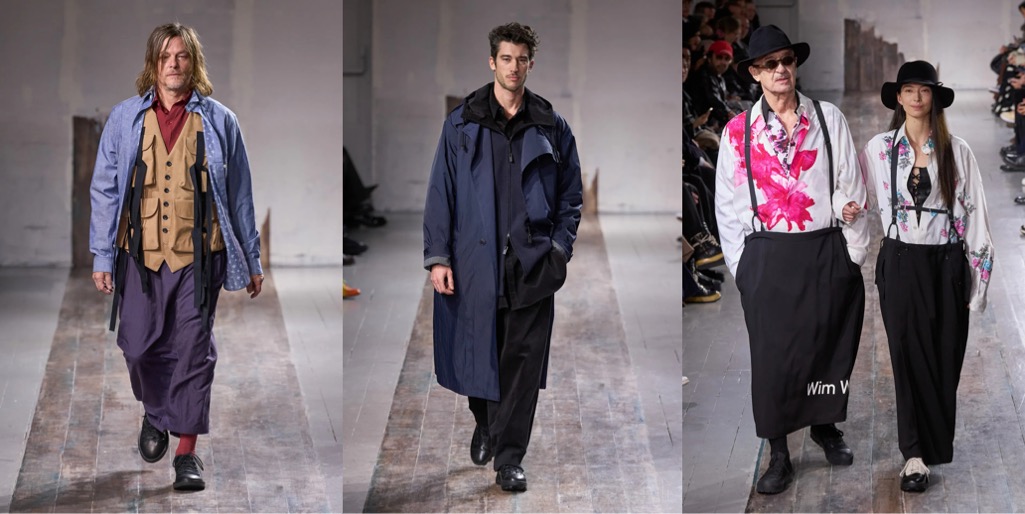 Yohji Yamamoto is designer with an endless fascination for artists – the individualism, the impulses, and the archetypes. From the loosely knotted poets’ blouse and a coat with peaked shoulders, to the sumptuous attire in velvet and brocade, this was a collection for that certain “genius working in the studio” person. Uniform of loose jackets and utility vests; shirts covered in vivid brushwork tucked into suspendered trousers. Dressed in these ensembles were some of his longtime artist collaborators – Wim Wenders and Max Vadukul – along with Warren Ellis, Norman Reedus, and the dancer Brandon Miel Masele. And while they appeared like distinctive personages, they also conjured some essence of the designer himself. For one of his two strolls down the runway, Vadakul donned a coat with “old bohemian” along the back. Would men consider this a badge of pride, a way of confronting reality with a smirk? “We’re older but that’s the only thing that changes,” the photographer acknowledged backstage. “What we create is still the same.” The show closed with Wenders in trousers printed with his name. Yamamoto and the filmmaker worked together in 1989 when the director made Notebook, a documentary about cities and clothes. Yamamoto noted how they were both children born in the aftermath of war-torn cities and have alchemized that darkness into work that has a poetic resonance. If the collection unleashed ideas with a sort of feisty enthusiasm, the pace was calm, and the mood was poignant.