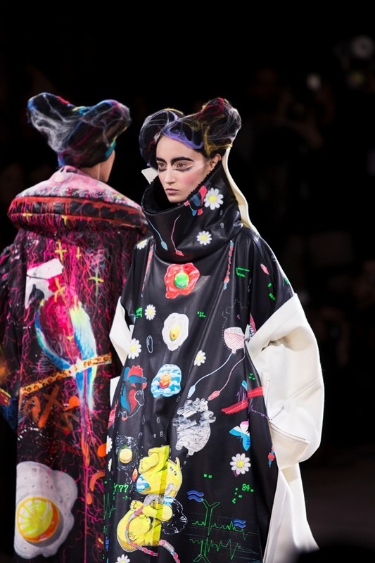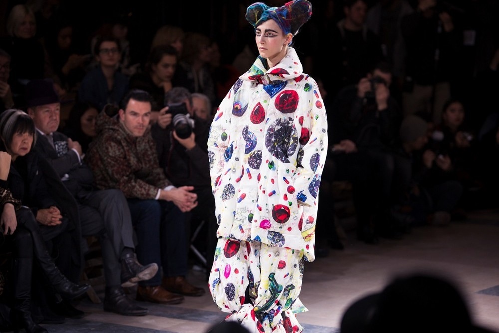 I am really into Yohji Yamamoto this season. His menswear for fall got me high (all these fantastic coats are on my wishlist!) and now this collection for women… Hypnotic manga fantasies come alive in voluminous cocoon coats and decorated leather, like by magic! Yohji, known for using only black in his collections, said backstage, that many people told, him that he uses too much of black… So he made it again, in his own way- black, huge, huge coats worn with colourful hats; then, again these coats, but with hand-painted yellow roses on! Some kind of eyes, mouths, toys, monsters came across. Acid coloured trolls and one-eyed demons became part of a hypnotic Japanese manga print that adorned enormous goose down padded coats. While hand painted illustrations of astronauts and leopards decorated leather coats. And then, the ‘hair’ was crafted from coloured wool into extreme shapes, like abstract paintings. Each model was marked with black paint around their eyes, like fantasy warriors. That show got really something in it… Maybe because we came to Yamamoto’s genius once again?